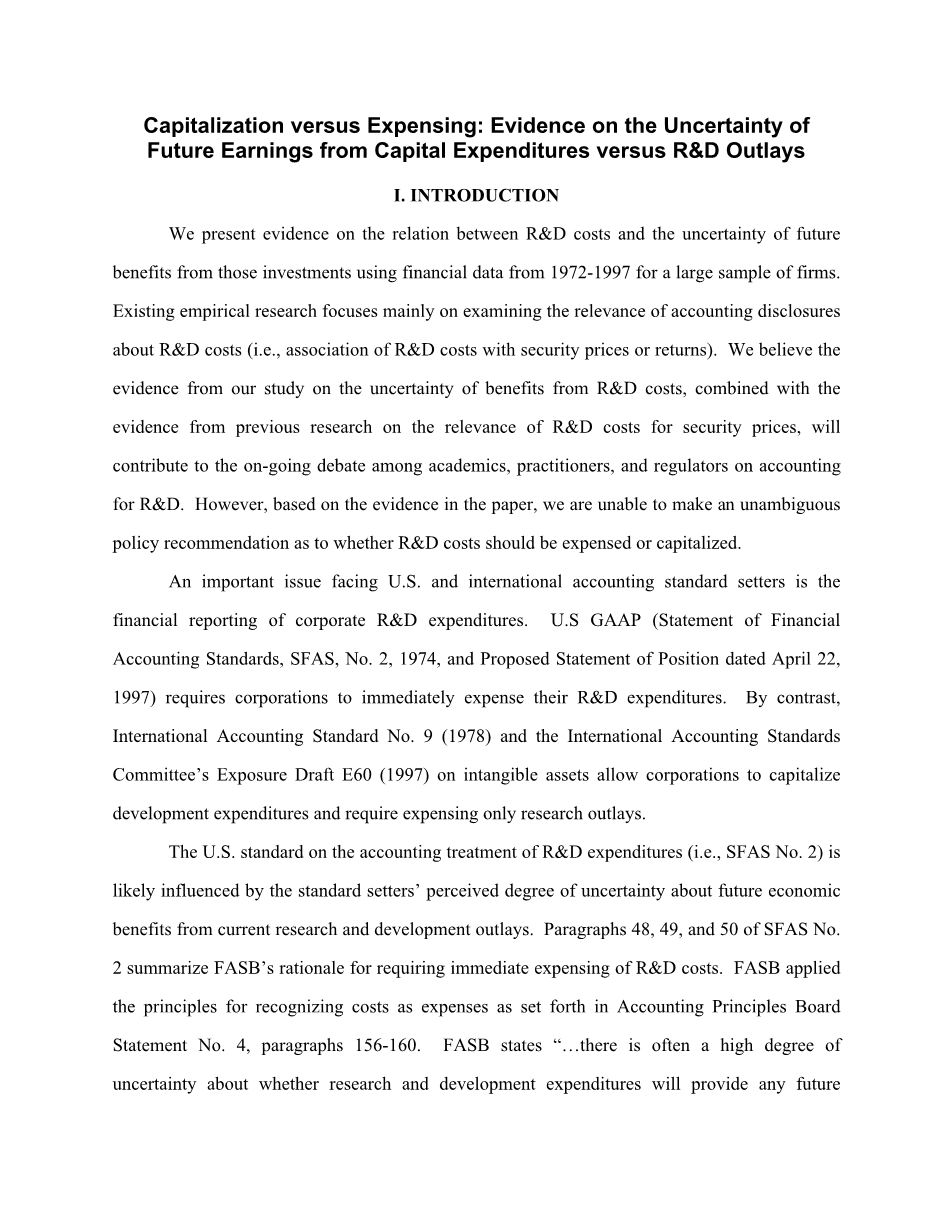 美国和国际会计准则制定者面临的一个重要问题是公司研发支出的财务报告。美国公认会计准则(财务会计标准公告,SFAS 1974年第2号,以及1997年4月22日拟议的立场声明)要求企业立即将研发支出费用化。相比之下,国际会计准则1978年第9号文件和1997年国际会计准则委员会关于无形资产的征求意见稿E60允许公司将开发支出资本化,只需将研究支出费用化。
