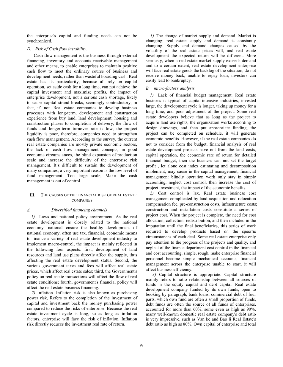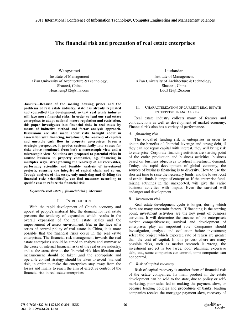 摘要:由于房价飞涨和房地产业存在的问题,国家已经对房地产业的发展进行了调控,这使得房地产行业面临更多的金融风险。为了引导我国房地产企业适应国家宏观调控和约束,本文采用归纳法和因子分析法对房地产金融风险进行了研究。讨论了房地产企业融资、投资、资本回收、现金流不稳定等方面带来的风险。从战略角度,系统地从宏观和微观两个角度探讨了上述风险的成因。针对房地产企业日常业务中存在的潜在风险,如多元化融资、加强应收账款回收、对投资项目进行科学可行的分析、确保资本链的完整性等,提出了解决方案。通过本文的分析,只有科学地分析和划分金融风险,才能根据具体情况找到降低金融风险的措施。