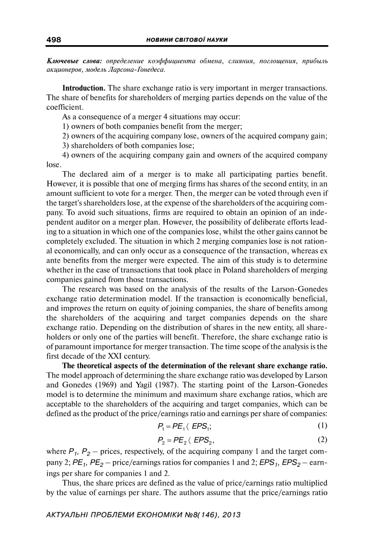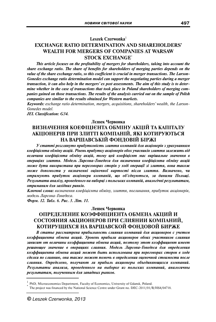 该研究基于对Larson-Gonedes交换比率确定模型的结果的分析。如果交易具有经济效益,并提高了参与公司的股本回报率,那么收购公司和目标公司股东之间的利益份额取决于股票交换比率。根据新实体的股份分布,所有股东或只有一方将受益。因此,股票交换比率对于合并交易至关重要。本次分析的时间范围是二十一世纪的前十年。