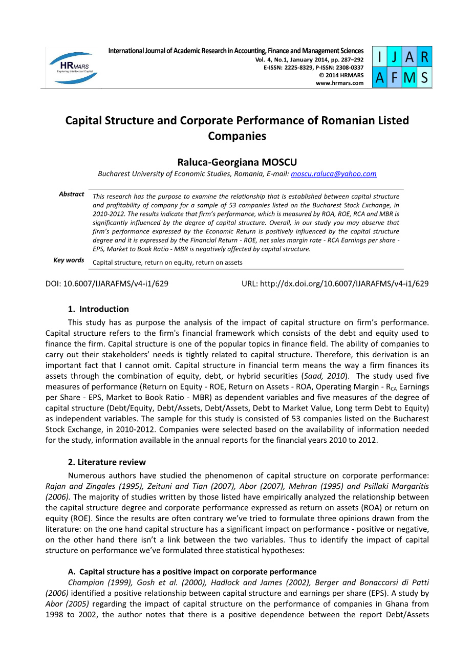 许多作者研究了公司业绩的资本结构现象:Rajan和Zingales(1995),Zeituni和Tian(2007),Abor(2007),Mehran(1995)和Psillaki Margaritis(2006年)。 列出的大多数研究都是凭经验分析了它们之间的关系,资本结构程度和公司业绩表示为资产收益率(ROA)或收益率净资产(ROE)。 由于结果往往相反,我们试图制定三个意见文献:一方面资本结构对绩效产生重大影响 - 积极或消极,另一方面,两个变量之间没有联系。从而确定资本的影响在绩效结构上我们制定了三个统计假设: