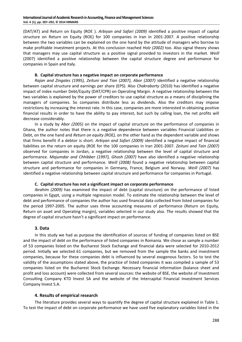 Rajan和Zingales(1995),Zeituni和Tian(2007),Abor(2007)发现了资本结构与每股收益(EPS)之间的一种负面关系。 Chakraborty(2010)也发现了指数债务/权益(DAT / CPR)对经营保证金之间的负面关系。两个变量的解释是债权人利用资本结构作为约束公司经理的手段。因此,公司分配的股息较少。债权人也可以通过强制执行提高利率来限制。在这种情况下,公司更有兴趣获得积极的财务结果是为了有能力支付利息,但通过调用贷款,净利润将大大减少。在Abor(2005)的一项关于资本结构对公司业绩影响的研究中作者加纳指出,金融负债或金融负债之间存在负相关关系,一方面是股本回报率(ROE),另一方面是因变量并显示如果债务人很少,公司就会受益。 Arbiyan和Safari(2009)发现了金融业的负面影响股本回报负债(2001 - 2007)年伊朗100家公司的净资产收益率.Zeituni和Tain(2007)观察到约旦公司,资本结构水平与负面关系性能。 Majumdar和Chhibber(1997),Ghosh(2007)也发现了资本结构与绩效之间的一种负面关系。威尔(2008)通过德国,法国,比利时和挪威公司的结构和业绩发现资本之间存在负相关关系。威尔(2007)确定了葡萄牙公司资本结构与业绩之间的负相关关系。