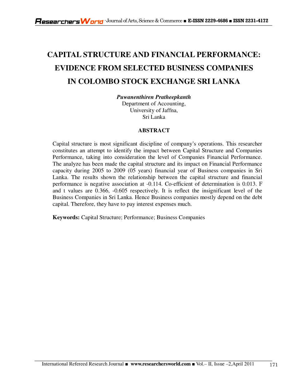 资本结构和财务业绩——基于斯里兰卡科伦坡股票交易所的上市公司的经验证据外文翻译资料