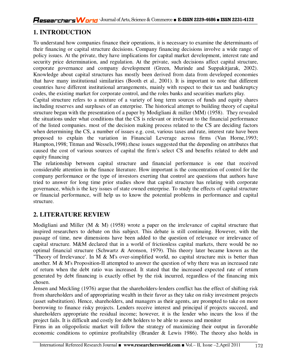 资本结构与财务绩效之间的关系是金融文献中备受关注的一种。对公司业绩的控制集中度或施加控制权的投资者的类型有多重要,这是作者长期以来试图回答的问题。先前的研究表明,资本结构与公司治理有关,这是国有企业的关键问题。研究资本结构或财务绩效的影响,将有助于我们了解绩效和资本结构中的潜在问题。