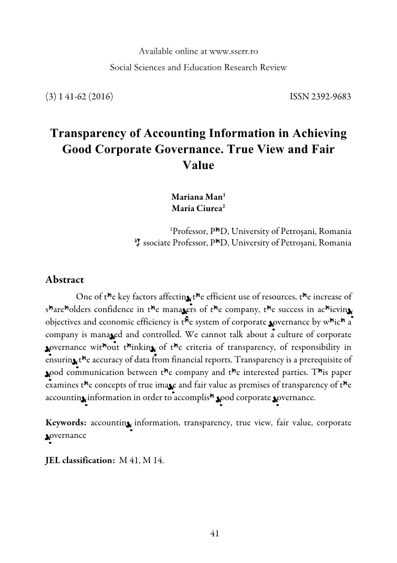 导致全球危机蔓延的全球公司丑闻和财务失败主要是由控制系统和审计职能的缺陷造成的。在这种背景下,不恰当的信息呈现对整体形势产生负面影响。因此,信息透明度已成为高效资本市场最佳运作的关键要素,也是企业治理稳固机制的重要特征。提供关于市场参与者和他们进行交易的有用和透明的信息这是市场经济正常运作和良好公司治理最重要的先决条件之一。我们不能在不考虑透明度的情况下讨论公司治理文化,也不能讨论确保财务报告数据准确性的责任标准。会计行业继续在公司治理文化中发挥重要作用,对公共利益负责,实现均衡和可持续的经济发展。 每个专业账户都必须了解他们在确保公司治理有效和高效方面的作用。账户专家或专业账户也是公司内适当公司治理背景下最佳实践的基础,因为会计行业必须负责推广公司治理服务的良好实践(Iorgulescu&Marcu,2015; Ionescu,2015)。