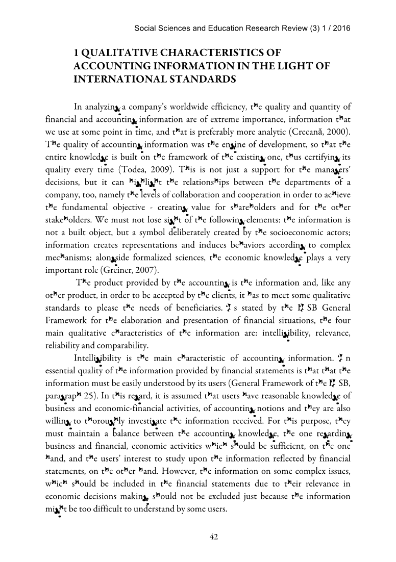 在分析公司的全球效率时,财务和会计信息的质量和数量非常重要,我们在某个时间点使用的信息最好更具分析性(Crecană,2000)。 会计信息的质量是发展的动力,所以整个知识都建立在现有的框架之上,从而每次才可以证明其质量(Todea,2009)。这不仅是对经理人决策的支持,也可以突出公司各部门之间的关系,即合作与合作的水平,以实现基本目标为基础即为股东和其他人创造价值。我们不能忽视以下内容:信息不是一个构建的对象,而是社会经济行为者故意创造的一个象征; 信息根据复杂的机制创造表征并诱导行为; 随着形式化科学的发展,经济知识扮演着非常重要的角色(Greiner,2007)。