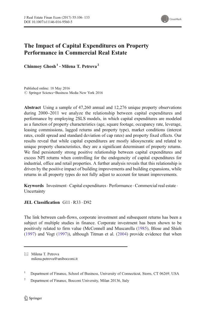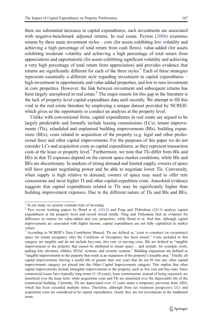 在第二阶段,经过核算资本支出的内生性,我们观察到除了公寓之外,所有房产类型中房地产投资与超额收益之间存在强烈的正相关关系。在公寓模式中,这种关系是负面的。进一步的检验表明,结果是由TI和BI与回报之间的负面关系驱动的,尽管BE和其他支出与超额回报正相关。当通过资本支出类别检验关系时,我们发现通常情况下,商业智能,BE和其他资本支出与超额收益正相关,而TI在所有模型中均为负值。这些结果表明,资本支出(不包括TI)通过租金和随后的价值比其相关投资产生更大的影响。换句话说,当资产支出的NPV是正值时,障碍率是类似房地产类型和市场的回报率。相反,由于对空间市场条件的依赖,TI是负NPV投资,这并不奇怪。本文的其余部分结构如下:我们讨论相关文献,并将我们的研究方法论放在“背景与研究方法论”部分。