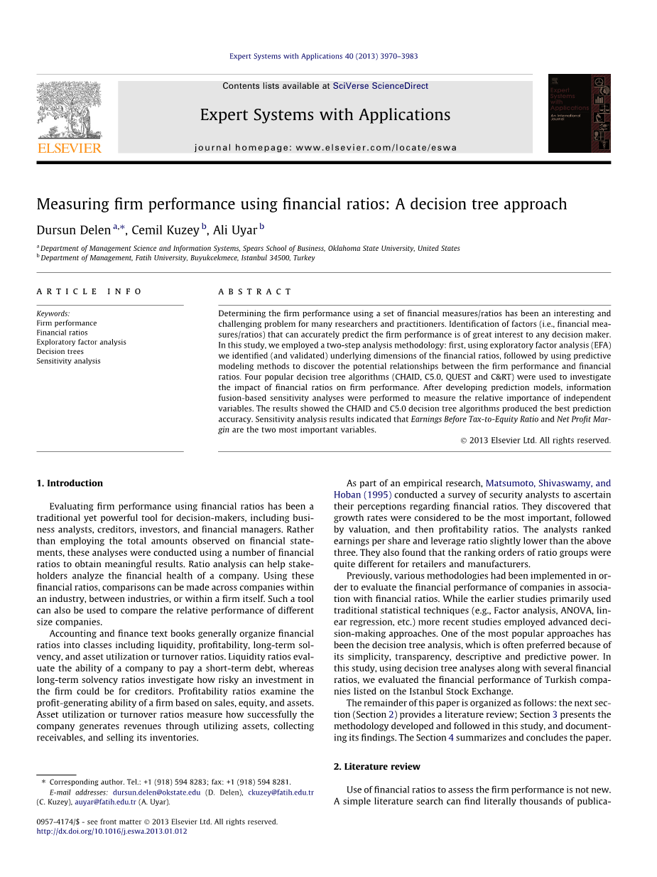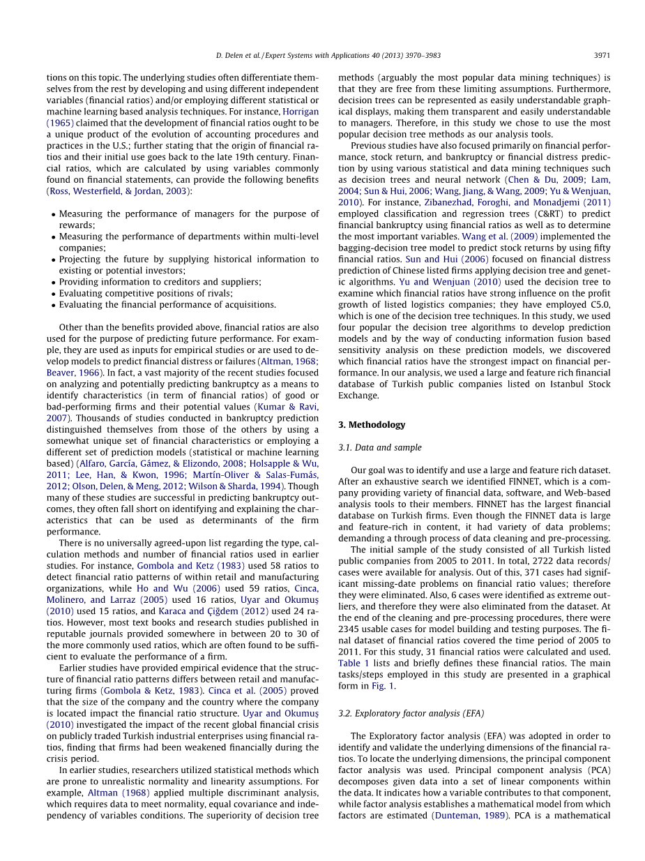 2010)。 例如,Zibanezhad,Foroghi和Monadjemi(2011)采用分类和回归树(C&RT)来预测金融破产,并使用金融比率来确定最重要的变量。王等人 (2009年)通过使用财务比率来实现装箱决策树模型来预测股票收益。孙和辉(2006)重点研究应用决策树和遗传算法的中国上市公司财务困境预测。余和文娟(2010)用决策树来检验哪些金融比率对上市物流公司的增长有强烈的影响; 他们采用了C5.0,这是决策树技术之一。 在这项研究中,我们使用四种流行的决策树算法来开发预测模型,并通过对这些预测模型进行基于信息融合的灵敏度分析,我们发现哪些金融比率对金融业绩影响最大。 在我们的分析中,我们使用了在伊斯坦布尔证券交易所上市的土耳其上市公司的大型功能丰富的金融数据库。
