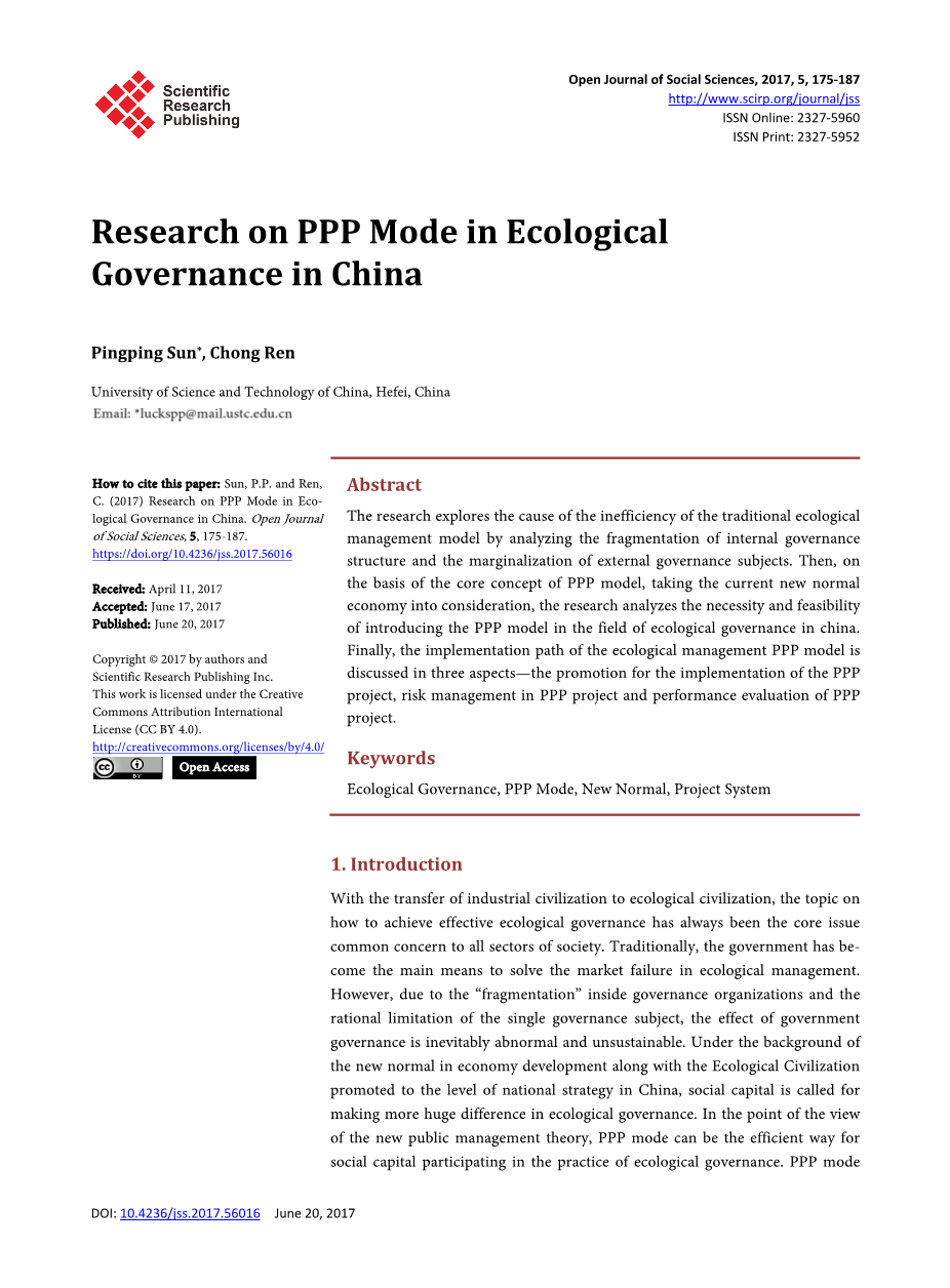 将PPP模式引入生态治理,可以拓宽融资渠道,带来先进的项目管理经验,不仅能够有效解决传统生态治理效率低下的问题,而且为发展提供了广阔空间 在新常态背景下的社会资本存量。研究表明PPP模式引入中国生态治理的必要性和可行性,并探讨其实施路径。 研究的主要贡献在于,对新常态的现状给予了更多的关注,并对PPP项目中公共价值的重要性进行了论证。 本研究的主要创新之处在于在PPP项目的实施中首次提出了“PPP区域包装”的方法。 然而,由于作者进一步的理论研究能力薄弱,研究的局限性在于缺乏PPP模式具体应用于各种生态治理项目的论证。 未来可以利用技术手段建立生态治理PPP项目模型,为生态治理实践提供更为具体的理论指导。