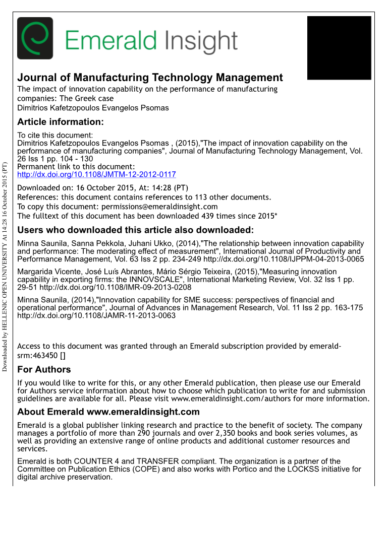 本研究采用的分析程序包括初步探索性因素分析(EFA)以揭示变量的基本结构。然后,使用验证性因素分析(CFA)来细化EFA中得出的尺度,并确定测量变量(即指标)的因素数量和相关负荷是否符合预先建立的理论基础上的预期结果。用结构方程模型(SEM)技术研究了233家希腊制造企业的“创新能力”与“产品质量”,“运营绩效”和“财务绩效”之间的关系。通过对目前经验数据的分析,“创新能力”对企业绩效关键维度的贡献越来越明显。