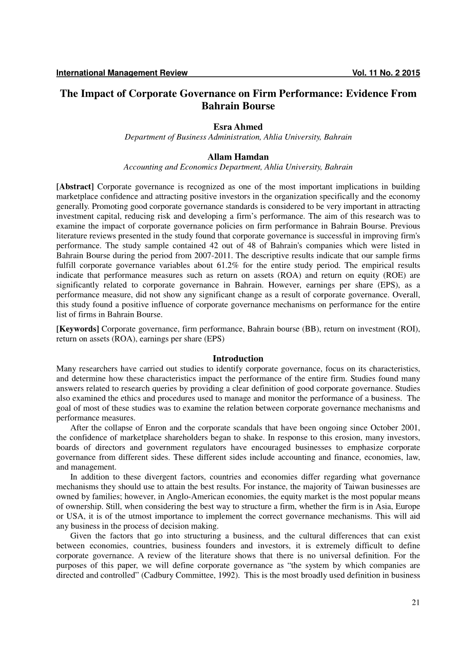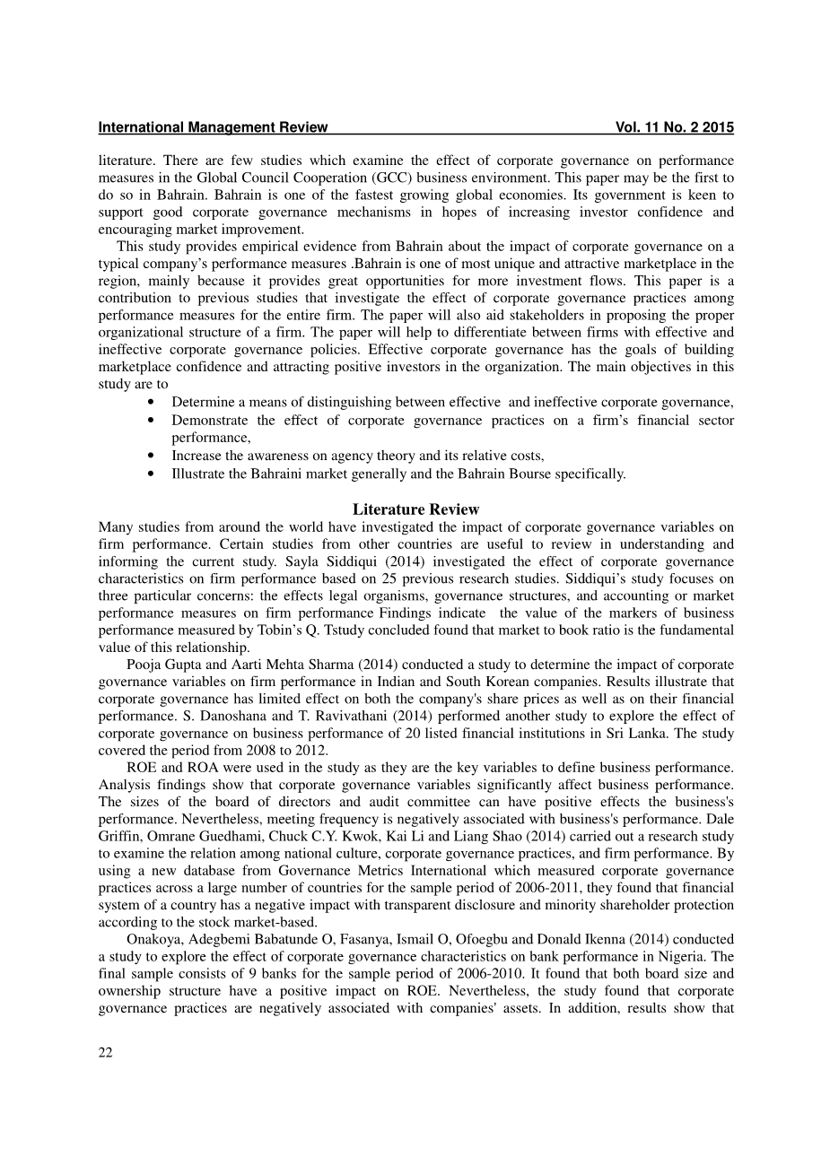 许多研究人员已经进行了研究,以确定公司的治理,集中在其特点,并确定如何影响整个公司的业绩。研究提供了一个明确的定义,良好的企业管治的研究发现许多答案。研究还考察了管理和监控企业绩效的伦理和程序。这些研究的目标是研究公司治理机制与绩效的关系。安然公司的倒闭和公司的丑闻,自十月2001以来一直持续,市场的信心开始动摇。为了应对这种侵蚀,许多投资者、董事会和政府监管机构都鼓励企业从不同侧面强调公司治理。这些不同的方面包括会计和金融,经济,法律和管理。除了这些不同的因素,国家和经济体的不同的治理机制,他们应该使用,以达到最佳的结果。例如,台湾的绝大多数企业都是家族拥有的,然而,在英美经济体中,股票市场是最受欢迎的所有权方式。然而,当考虑到一个公司的最佳方式,无论是在亚洲,欧洲还是美国,它都是最重要的,以实现正确的治理机制。这将帮助任何企业在决策过程中。考虑到构建一个企业的因素,以及经济、国家、企业创始人和投资者之间存在的文化差异,定义公司治理是非常困难的。文献回顾显示,没有普遍的定义。本文的目的,我们将定义为“企业治理系统的公司进行指导和控制”(Cadbury委员会,1992)。这是商业上最广泛使用的定义文学。很少有研究探讨公司治理对全球理事会合作绩效措施的效果(GCC)的商业环境。本文可能是第一个这样做,在巴林。巴林是全球增长最快的经济体之一。它的政府热衷于支持良好的公司治理机制,希望能增加投资者信心,鼓励市场改善。这项研究提供了一个典型的公司的绩效指标的影响公司治理巴林的经验证据,巴林是该地区最具吸引力的市场之一,主要是因为它提供了更多的投资流动的机会。本文是对以前的研究,调查的影响,企业管治的整个公司的绩效措施的影响。该文件还将帮助利益相关者提出一个公司的组织结构合理的。本文将有助于区分公司与有效和无效的企业管治政策。有效的公司治理目标是建立市场信心,吸引积极的投资者。