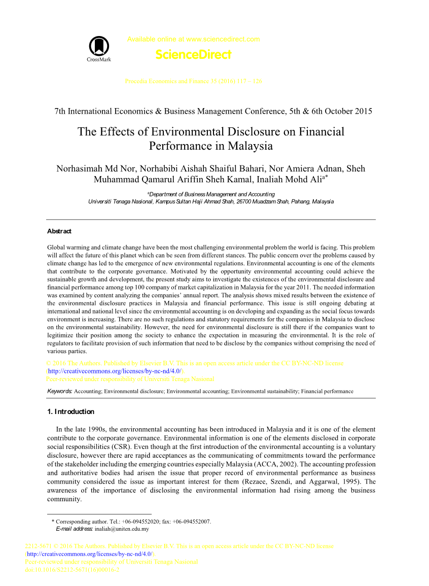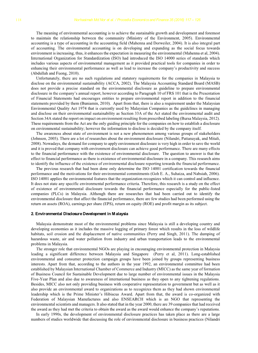 本研究考察了马来西亚的上市公司中,环境信息的披露和公司财务业绩之间的关系。尽管环境信息的披露是自愿披露,然而大多公司关注环境并为保护环境作出贡献。公司强调他们在环保活动中的贡献使用了来吸引投资者,并满足利益相关群体的需求。Haslinda和格伦(2006),贸易本身的义务就是通知有关利益相关者参与致力于环境,这样的行动可以有利于贸易发展的稳定。