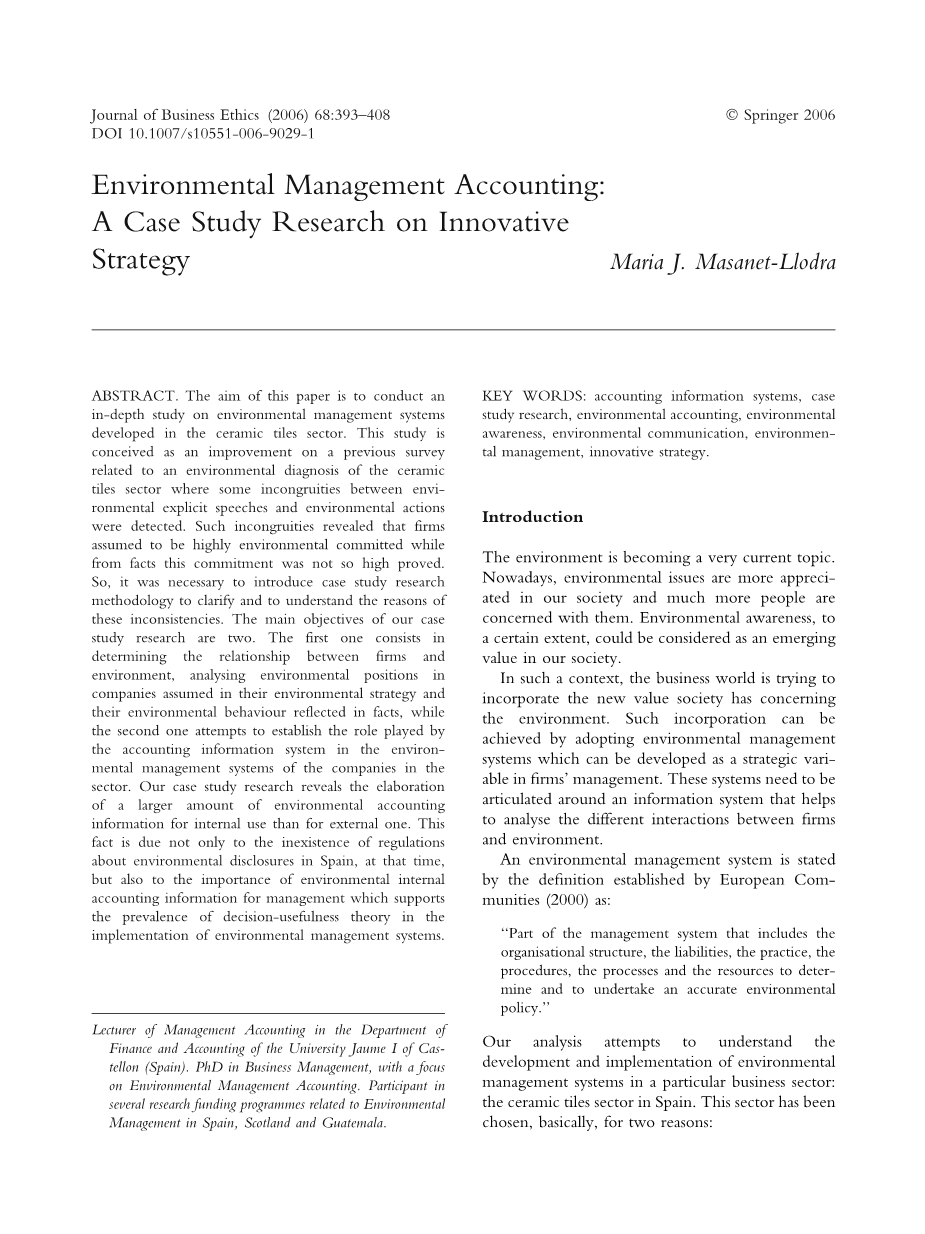 关键词:会计信息系统,案例研究,环境会计,环境意识,环境沟通,环境管理,创新战略。