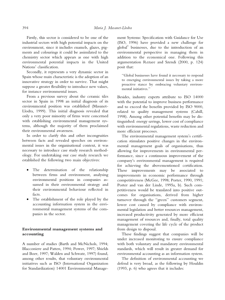 一些研究(Barth和McNichols,1994; Blacconiere and Patten,1994; Power,1997; Shields and Boer,1997; Walden and Schwatz,1997)发现,除自然环境措施外,诸如ISO(国际组织 标准化)14001环境管理体系:使用指南(ISO,1996)的规范为全球1个企业提供了新的挑战,因为除了经济管理之外,还引入了环境观点来管理它们。 在这个争论之后,Rezaee和Szendi(2000,第124页)认为: