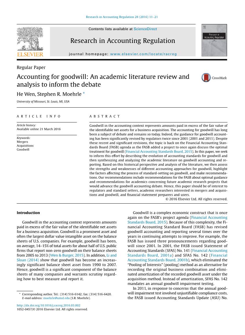 在会计范畴里,商誉指的是支付的金额超过企业收购的可辨认净资产的公允价值的部分。商誉会计一直是一个争议的话题,今天仍然如此。事实上,商誉会计指引自2001年(2001年和2011年)以来就被监管机构显著修订了两次。尽管有这些最近和重大的修订,但主题还是回到了财务会计准则委员会(FASB)的议程,因为财务会计准则委员会增加了一个项目以再次讨论商誉的最佳处理(财务会计准则委员会,2015)。在本文中,我们试图通过描述商誉会计准则的演变,然后合成和分析有关商誉的学术文献并加以报告,来试图告知我们在这方面的努力。基于历史视角和文献分析,我们评估商誉的不同会计方法的优势和弱势,突出影响商誉标准设置过程的因素并提出建议。我们的建议包括对财务会计准则委员会关于最佳指导的建议和对学术界关于未来学术研究项目,并且其将推动商誉会计辩论的建议。因此,本文应该能够引起监管机构,标准制定者,对合并、购并和商誉感兴趣的学术研究者以及财务报表编制者和使用者的兴趣。
