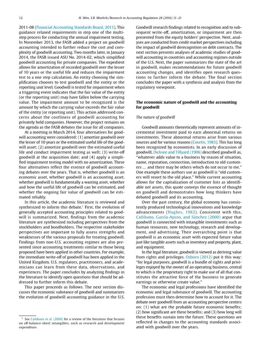 本文回顾及合成学术文献来说明此争论。首先,总结了一般公认会计原则与商誉有关的演变;然后,从学术文献中形成结论,包括股东和债券持有人的观点,其对于充分评估各种处理商誉的建议来说是重要的。同时也展示了关于非实行美国会计制度国家的结论,因为与那些建议相似的会计处理已经在别的国家进行了运用。例如,立即注销商誉已经运用于英国,监管机构、从业者和学术研究者能够从这些数据、观察和经验中学习。本论文通过对文献进行分析总结来确定有争议的问题,以期进一步的讨论。