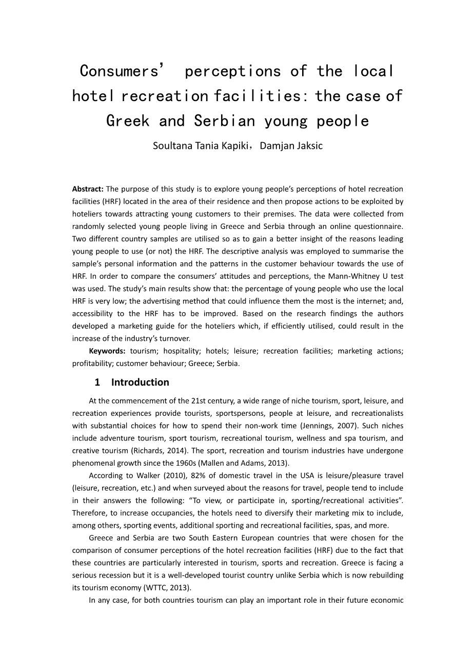 消费者对当地酒店娱乐设施的认知:以希腊和塞尔维亚年轻人为例外文翻译资料