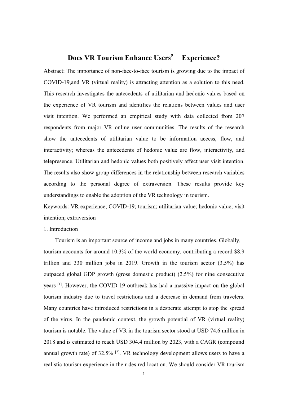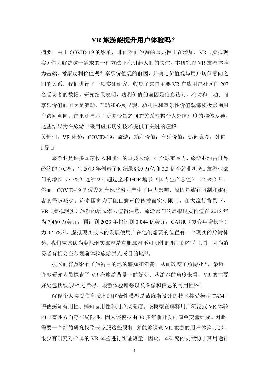 VR旅游能提升用户体验吗?外文翻译资料 2023-04-17 21:00:38 英语原文共 4 页,剩余内容已隐藏,支付完成后下载完整资料 英语译文共 3 页,剩余内容已隐藏,支付完成后下载完整资料 资料编号:[588964],资料为PDF文档或Word文档,PDF文档可免费转换为Word 您需要先支付 30元 才能查看全部内容!立即支付 发小红书推广免费获取该资料资格。点击链接进入获取推广文案即可: Ai一键组稿 | 降AI率 | 降重复率 | 论文一键排版 PREVIOUS NEXT 您可能感兴趣的文章 可持续农村旅游战略:发展和保护的工具外文翻译资料 电影诱导旅游:衡量的挑战和其他问题外文翻译资料 VR旅游能提升用户体验吗?外文翻译资料 基于网络文本分析的野生动物旅游体验外文翻译资料 网红旅游目的地旅游感知研究外文翻译资料 文化与旅游融合背景下“互联网 旅游”服务创新模式研究外文翻译资料 城市地铁旅游面临的环境和社会挑战建筑业:中国的一项实证研究外文翻译资料 基于地域计算的旅游文化创意产品设计研究——以四川成都文化为例外文翻译资料 文化节对当地居民参与的社会经济影响研究:卡●塔索文化旅游与艺术节.外文翻译资料 通过生态旅游开发实现三湾湿地资源的可持续利用外文翻译资料