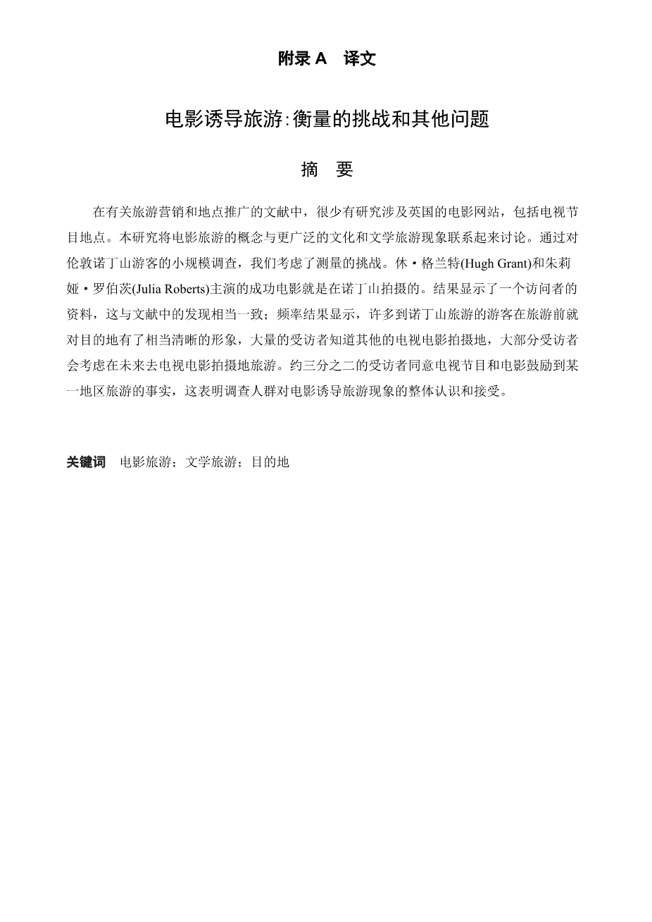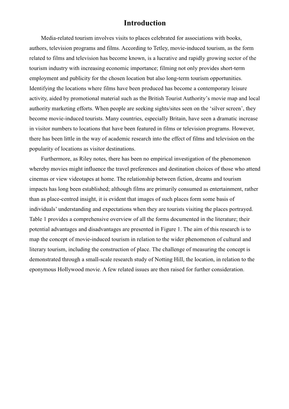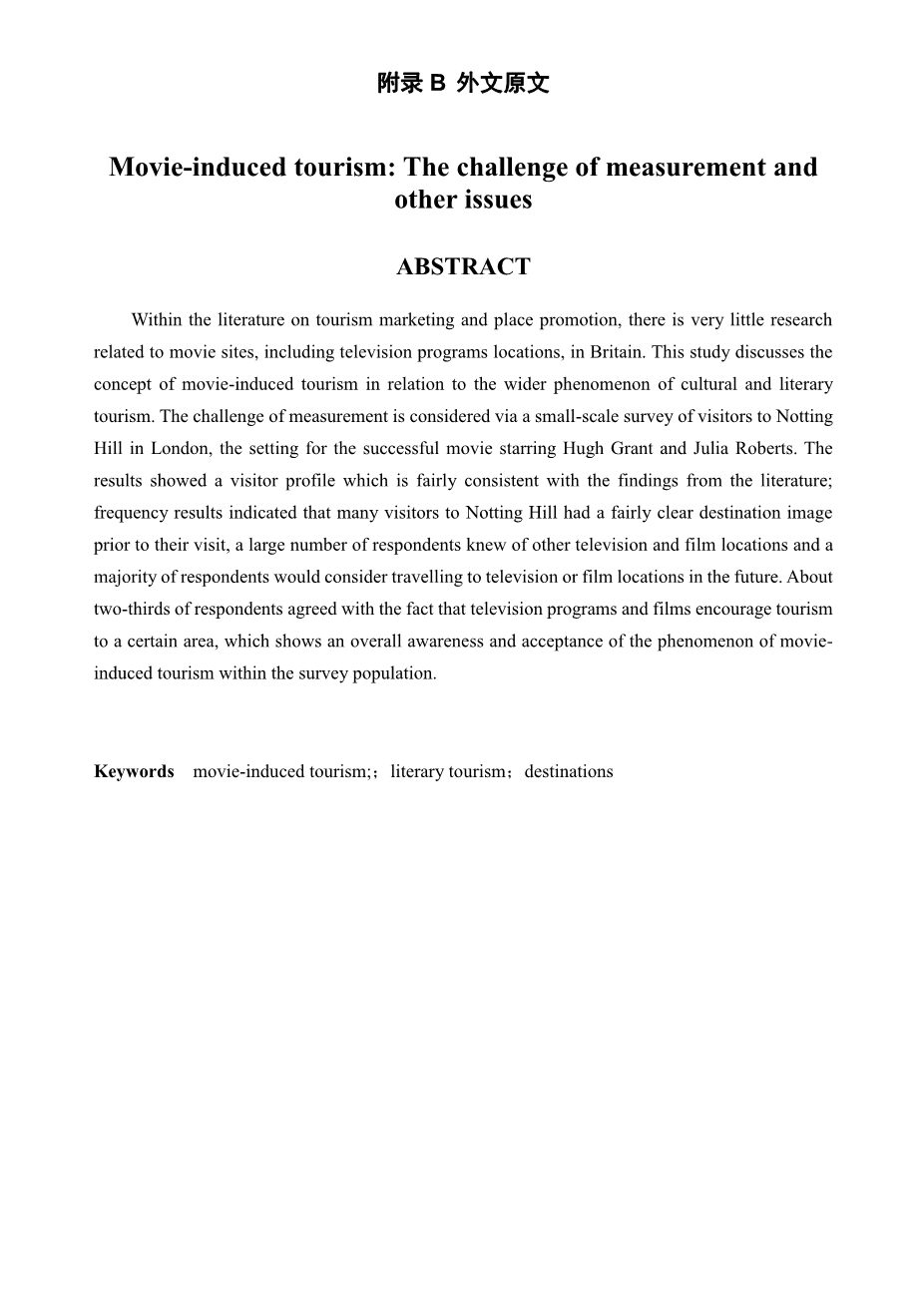 电影诱导旅游:衡量的挑战和其他问题外文翻译资料 2023-04-18 11:53:16 英语原文共 9 页,剩余内容已隐藏,支付完成后下载完整资料 英语译文共 8 页,剩余内容已隐藏,支付完成后下载完整资料 资料编号:[588803],资料为PDF文档或Word文档,PDF文档可免费转换为Word 您需要先支付 30元 才能查看全部内容!立即支付 发小红书推广免费获取该资料资格。点击链接进入获取推广文案即可: Ai一键组稿 | 降AI率 | 降重复率 | 论文一键排版 PREVIOUS NEXT 您可能感兴趣的文章 可持续农村旅游战略:发展和保护的工具外文翻译资料 电影诱导旅游:衡量的挑战和其他问题外文翻译资料 VR旅游能提升用户体验吗?外文翻译资料 基于网络文本分析的野生动物旅游体验外文翻译资料 网红旅游目的地旅游感知研究外文翻译资料 文化与旅游融合背景下“互联网 旅游”服务创新模式研究外文翻译资料 城市地铁旅游面临的环境和社会挑战建筑业:中国的一项实证研究外文翻译资料 基于地域计算的旅游文化创意产品设计研究——以四川成都文化为例外文翻译资料 文化节对当地居民参与的社会经济影响研究:卡●塔索文化旅游与艺术节.外文翻译资料 通过生态旅游开发实现三湾湿地资源的可持续利用外文翻译资料