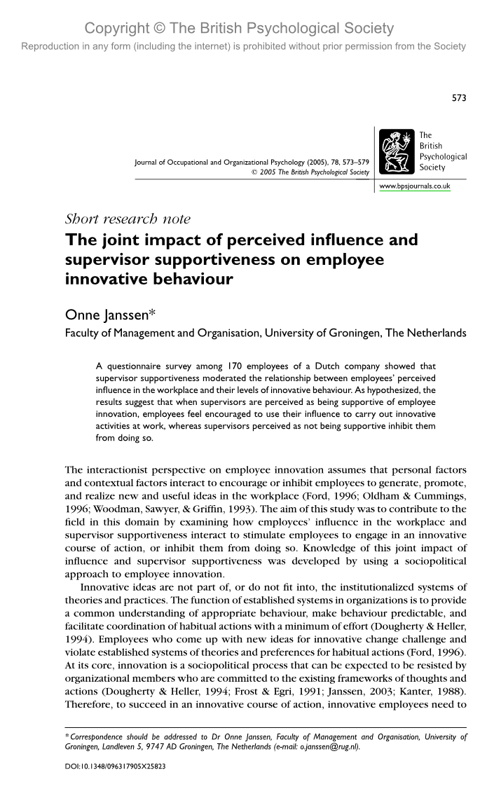 员工创新的互动观点认为,个人因素和情境因素相互作用,鼓励或抑制员工在工作场所产生、促进和实现新的和有用的想法(Ford, 1996; Oldham amp; Cummings,1996; Woodman, Sawyer, amp; Griffin, 1993)。本研究的目的是通过考察员工在工作场所的影响力和主管支持如何相互作用,来激励员工参与创新的行动过程,或阻止他们这样做,从而为这一领域做出贡献。我们运用社会政治方法对员工创新进行了研究,形成了影响力和主管支持共同影响的认识。