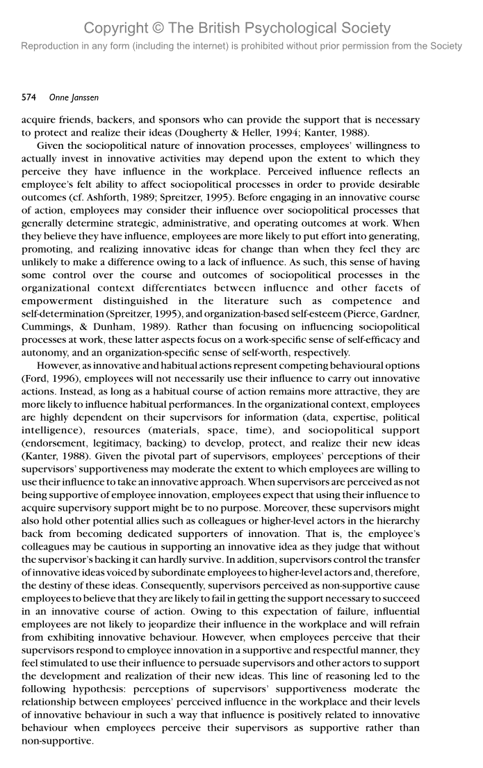 创新的想法不属于,也不适合,那些制度化的理论和实践体系。在组织中建立体系的功能是为了提供一种对适当行为的共同理解,使行为可预测,并以最少的努力促进习惯性行为的协调(Dougherty amp; Heller,1994)。为创新改变提出新想法的员工挑战、违反已经建立的理论体系和习惯性行为偏好 (Ford,1996)。从其核心来说,创新是一个社会政治进程,它会受到致力于现有的思想和行动框架的组织成员的抵制是可以预期到的。(Dougherty amp; Heller, 1994; Frost amp; Egri, 1991; Janssen, 2003; Kanter, 1988)。因此,要想在创新的行动过程中取得成功,创新的员工需要获得朋友、支持者和赞助者,这些人能够提供必要的支持以保护和实现他们的想法(Dougherty amp; Heller, 1994; Kanter, 1988)。