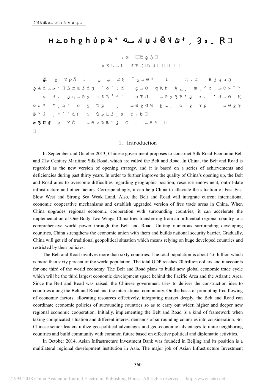 2013年9月和10月,中国政府提出建设丝绸之路经济带。21世纪海上丝绸之路,被称为“一带一路”。在中国,一带一路是。被认为是新版本的开放战略,它是基于一系列的成就和。过去三十年的不足。为了进一步提高中国对外开放的质量,这条皮带。而道路的目标是克服地理位置、资源禀赋、过时的困难。基础设施和其他因素。相应地,它也可以帮助中国缓解东部快速发展的局面。西部慢,海弱。此外,“一带一路”将整合当前国际。建立经济合作机制,建立中国自贸区升级版。当中国加强与周边国家的区域经济合作,可以加快推进。实现一个身体的两个翅膀。中国试图从一个有影响力的地区国家转移到它国。全面的世界力量通过“一带一路”。团结周围许多发展中中国加强与中国的经济联盟,建立国家安全屏障。渐渐地,中国将摆脱传统的地缘政治形势,这意味着依赖于巨大的发达国家。受政策限制。