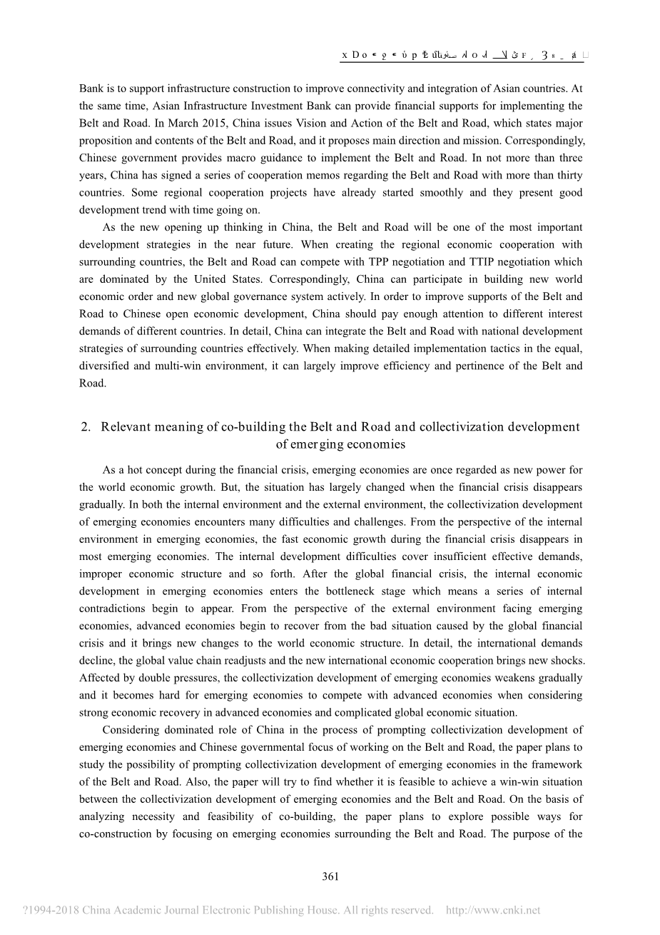 考虑到中国在促进集团化发展过程中的主导作用。新兴经济体和中国政府的重点工作在“一带一路”计划上。研究在框架内推动新兴经济体集体化发展的可能性。“一带一路”。同时,本文还将尝试找出实现双赢的可行性。在新兴经济体的集体化发展与“一带一路”之间。的基础上分析了共建共享的必要性和可行性,探讨了共建共享的可能途径。通过围绕“一带一路”周边的新兴经济体共同建设。本文的目的是为新兴经济体和新兴经济体的集体化发展提供新的思路。中国与其他新兴经济体之间的区域经济合作。