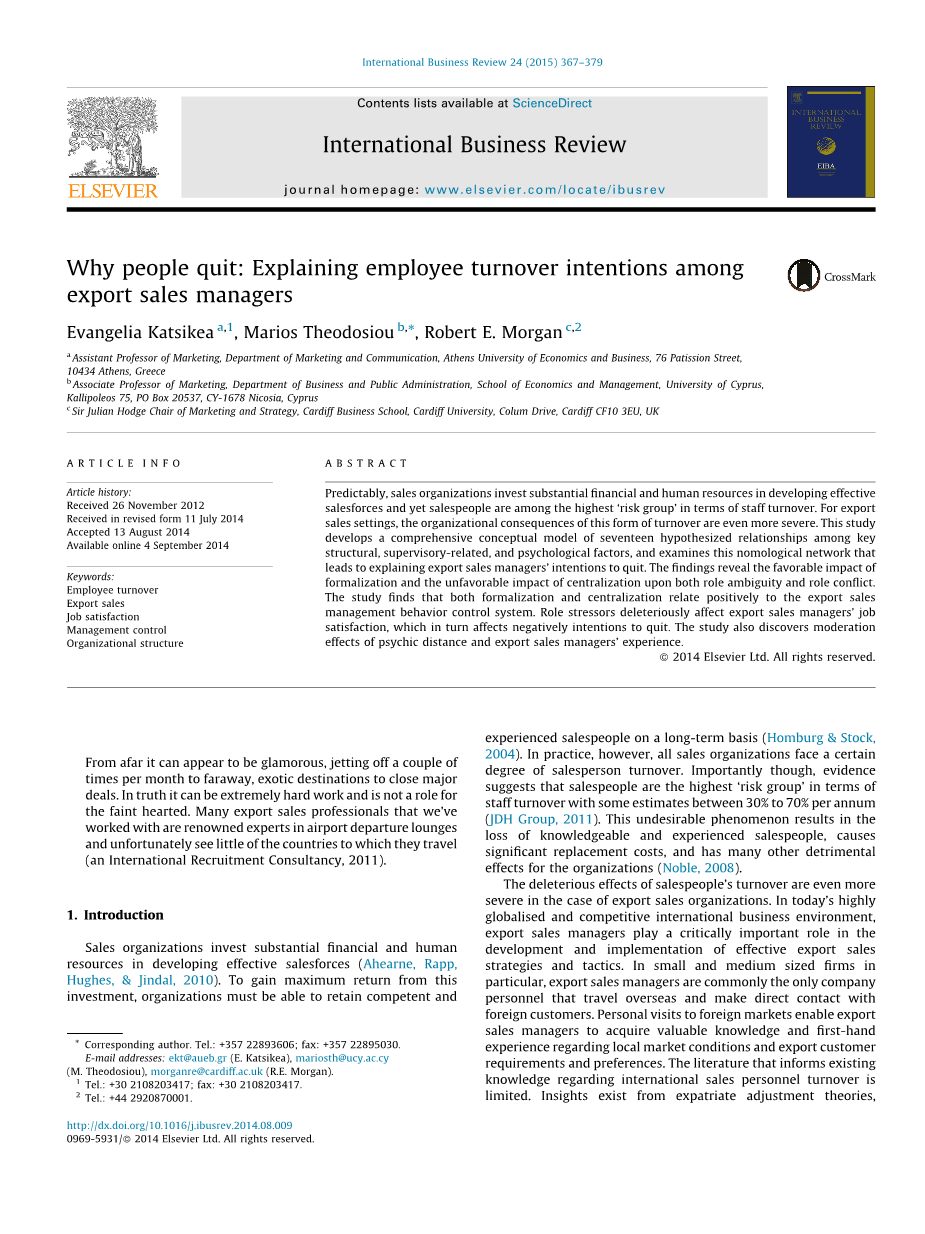 Why people quit: Explaining employee turnover intentions among export sales managers