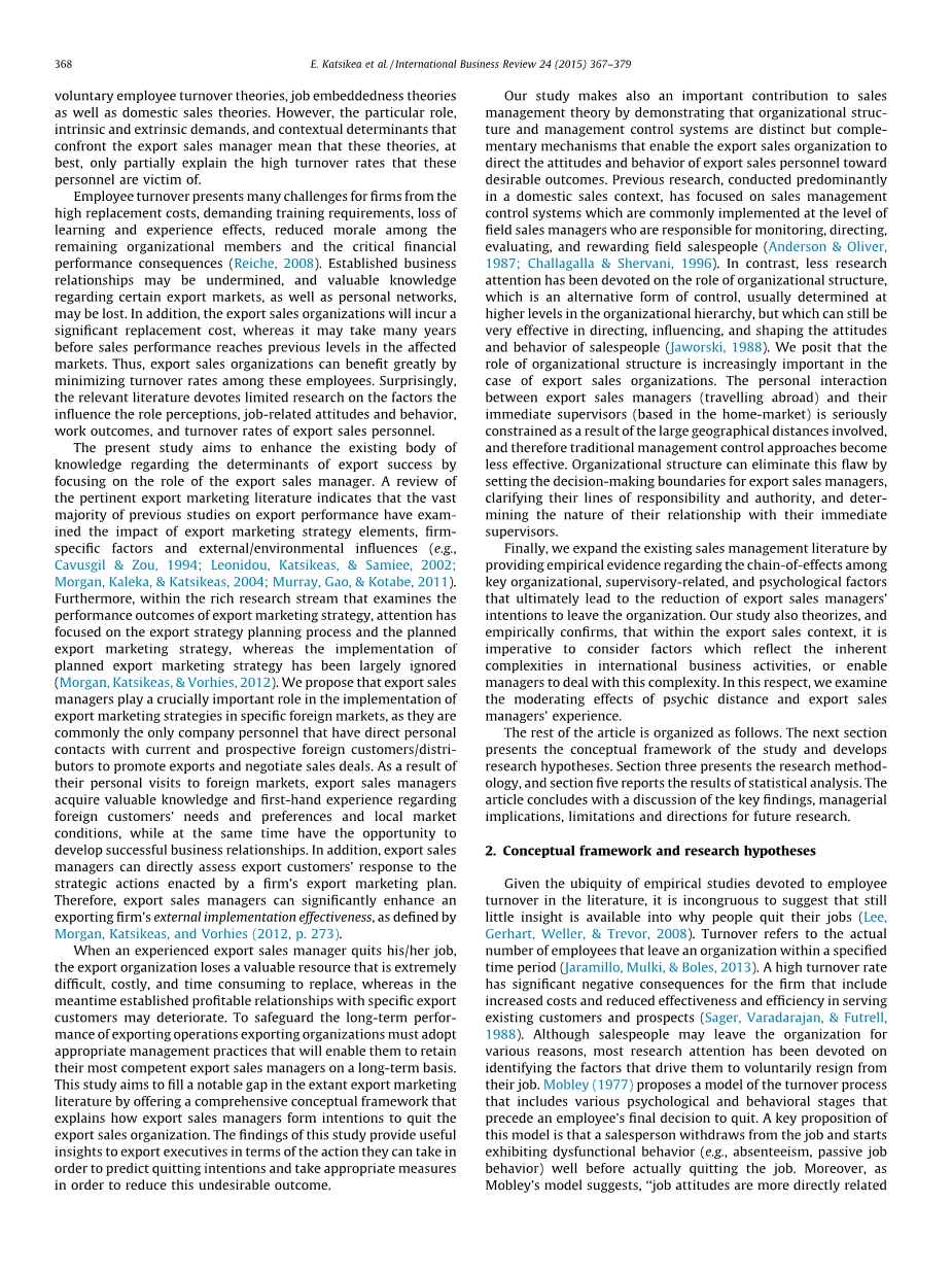 在出口销售组织的情况下,销售人员的营业额的有害影响更为严重。在当今高度全球化和竞争激烈的国际商业环境中,出口销售经理在制定和实施有效的出口销售战略和策略方面发挥着至关重要的作用。特别是在中小企业,出口销售经理通常是在海外旅行,直接与外国客户接触的唯一公司人员。个人访问国外市场使出口销售经理能够获得有关当地市场条件和出口客户需求和偏好的宝贵知识和第一手经验。通报现有知识有关国际销售人员离职的文献有限。存在外派调整理论,志愿员工离职理论,工作嵌入理论以及国内销售理论的见解。然而,出口销售经理面临的特殊作用,内在和外在需求以及背景因素意味着这些理论至多仅仅部分地解释了这些人员的高周转率。