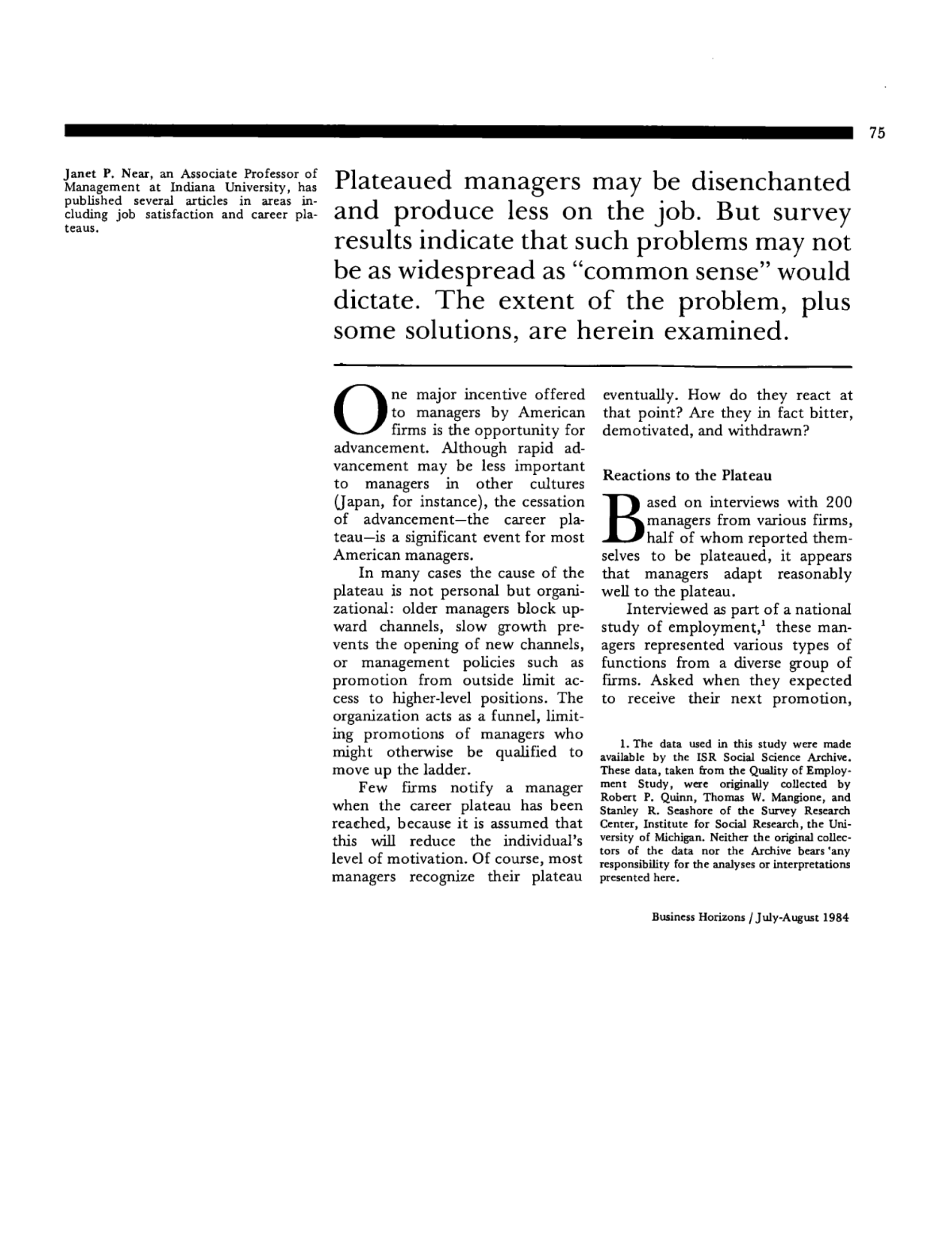 作为国家就业研究的一部分采访,这些管理人员代表了各种职能的不同类型公司。问他们什么时候会达到他们的下一次高原,百分之九十八的管理人员回答说二十年以后或者从来没有职业高原,这组分为稳定管理。没有职业高原的那一组管理者说他们将在未来一到十年内被提升。这无疑有一些停滞不前的管理者,然而,在这一组中,仍然有少部分人认为他们在五到十年内不会晋升。所以包括这些类型的没有职业高原的管理者不会很大地影响结果。