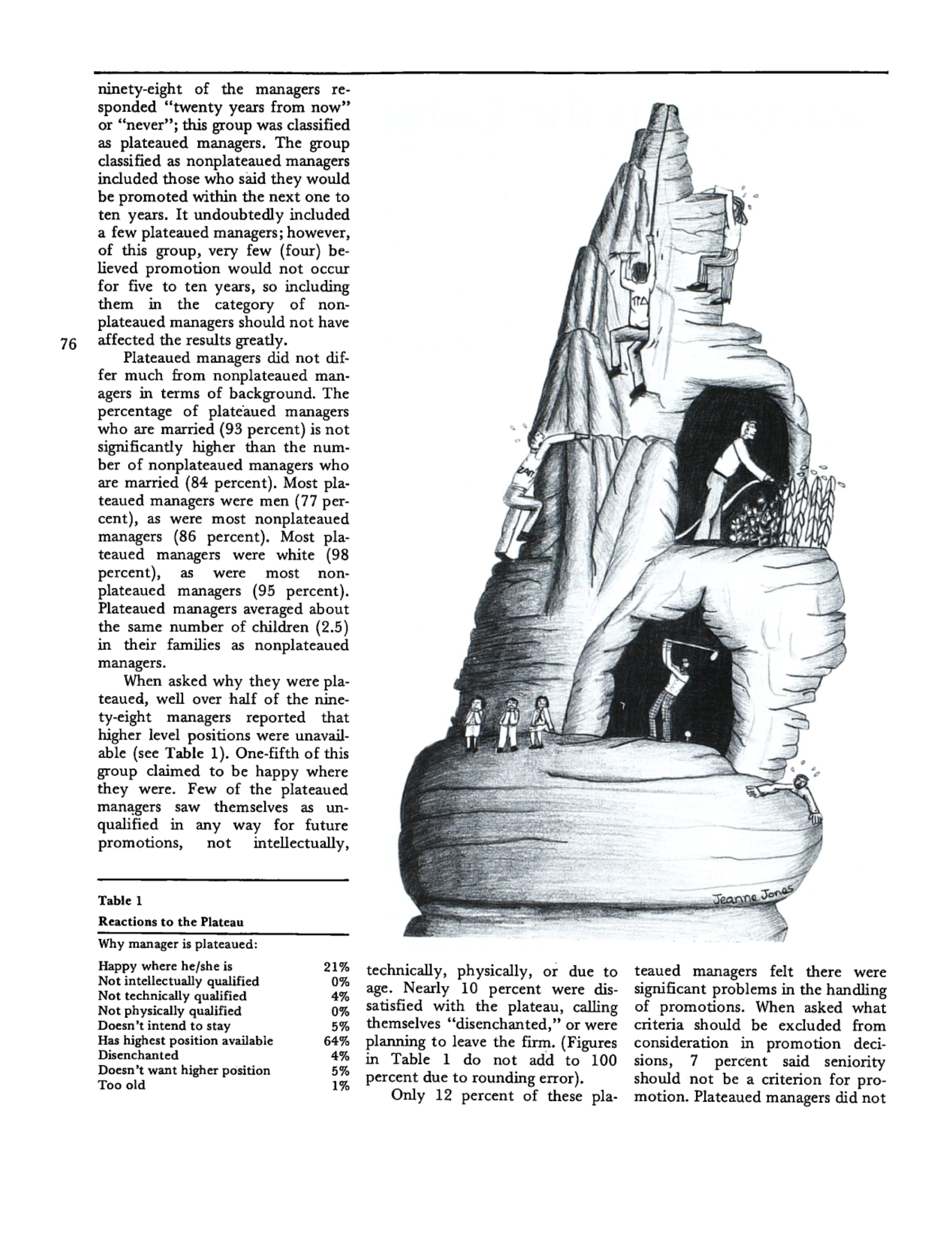 根据这里的数据,大约一半的管理人员职位都是固定的,其中大多数可以被称为“稳健的公民”,他们是不太可能升职获得未来的管理者,但仍保持可接受的绩效水平。因为他们的晋升速度在他们到达高原之前的几年里是缓慢的,而这些管理者们可能会适应在他们之前长时间停滞不前的状态。然而,其他非职业高原管理者认为,职业高原是一个严重的问题。