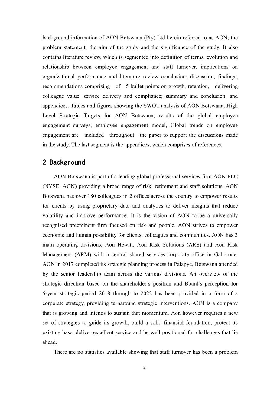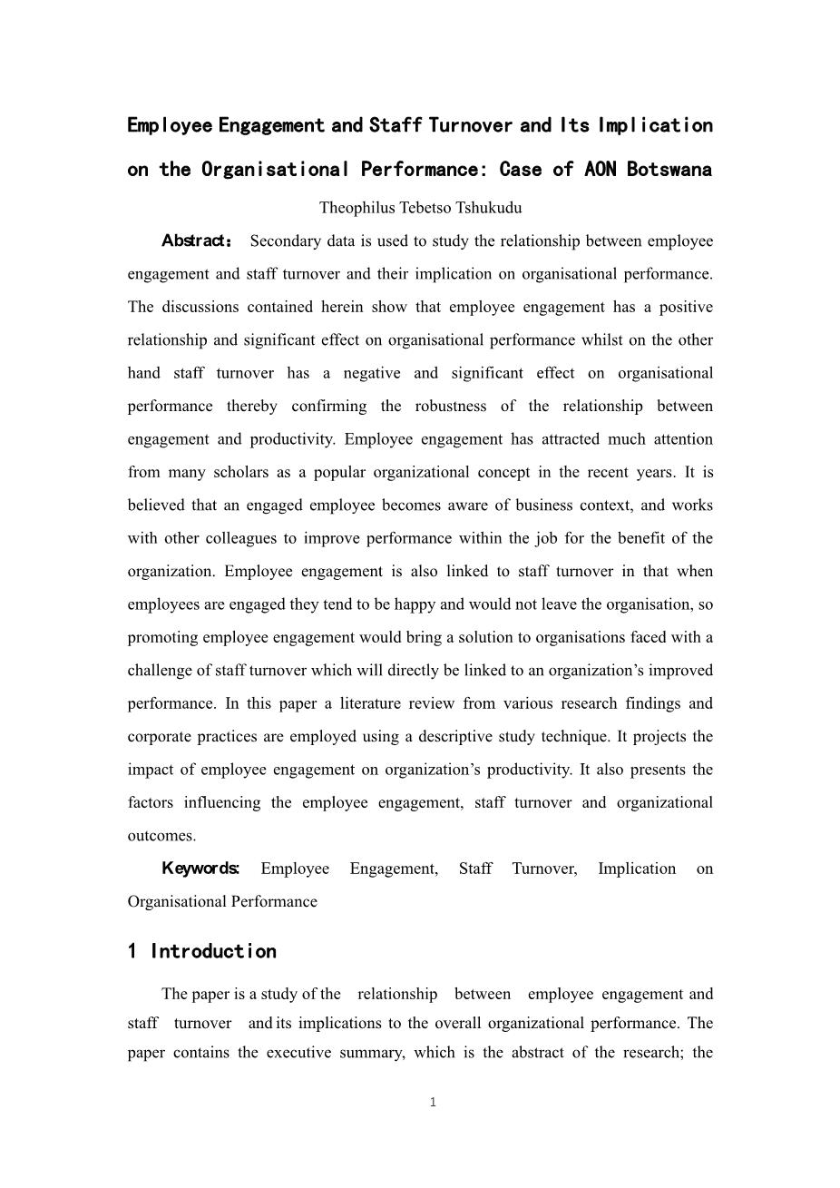本文研究了员工敬业度与员工离职的关系及其对组织整体绩效的影响。论文包括研究摘要、博茨瓦纳 AON 公司的背景资料、问题陈述、研究目的和研究意义。报告还载有文献综述,分为术语的定义、员工敬业度和员工离职之间的演变和关系、对组织绩效的影响和文献综述结论; 讨论、调查结果、包括关于增长、保留、提供同事价值、服务提供和遵守的5个要点的建议; 包括摘要和结论以及附录。本文件包括博茨瓦纳 AON 公司的 SWOT 分析、博茨瓦纳 AON 公司的高级别战略目标、全球员工敬业度调查结果、员工敬业度模型、员工敬业度全球趋势等图表,以支持研究中的讨论。最后一个部分是附录,包括整个参考文献。