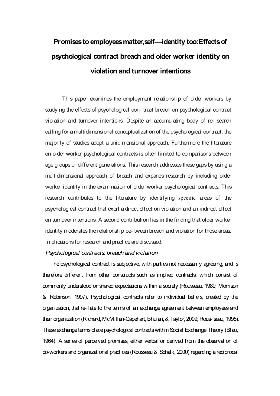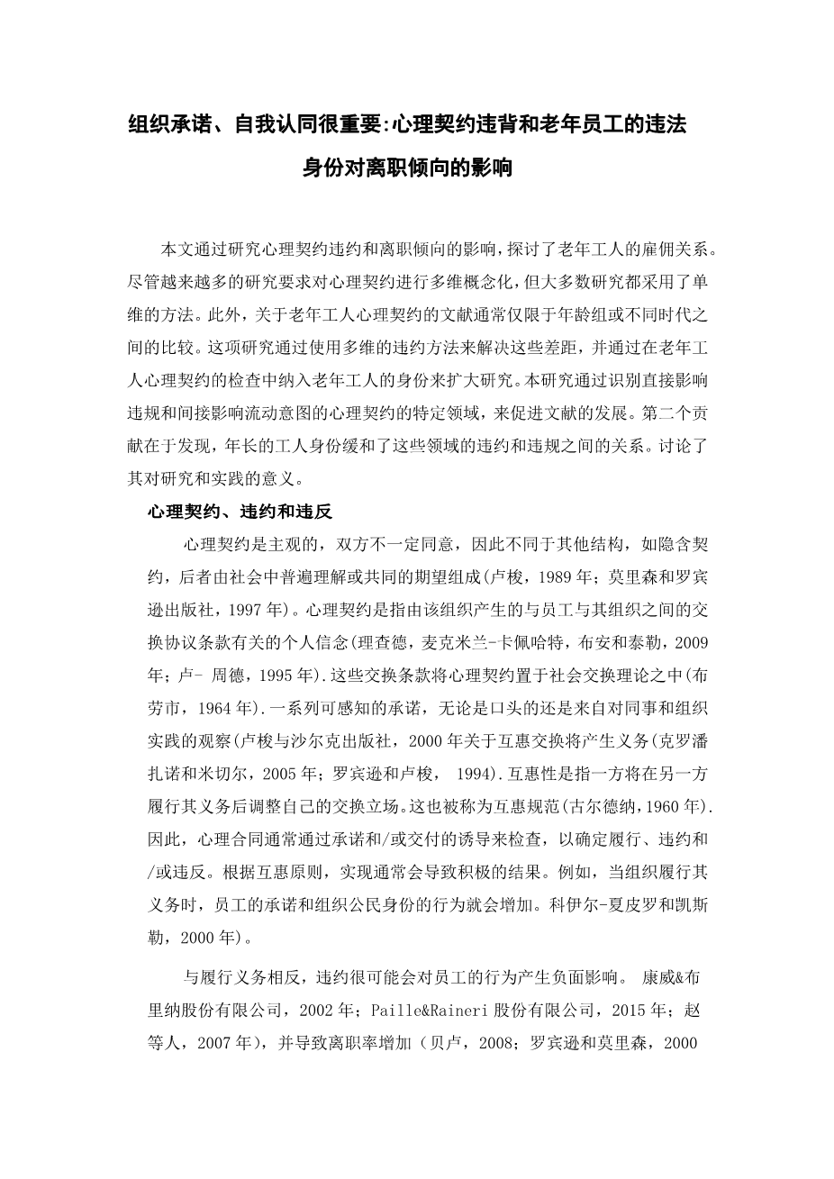 组织承诺、自我认同很重要:心理契约违背和老年员工的违法身份对离职倾向的影响外文翻译资料