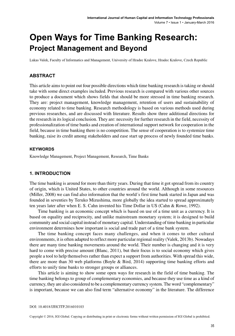 bull;从经验中学习:关于捷克共和国现有时间银行的信息和世界是有限的,但有可能访问它们中的一些。在捷克共和国那里是开启时间银行的一些记录(Valek,2013a)。即使没有足够的信息才能有真正的知识基础,有关各种问题的研究到时间银行业务(Valek,2013a; Valek,2013b; Valek&Tarasova,2014; Valek&Jasikova,2013;Valek,2014a)可能有助于获得额外的学习起点。更不用说可能支持更大的时间银行网络,这在一些国家存在。
