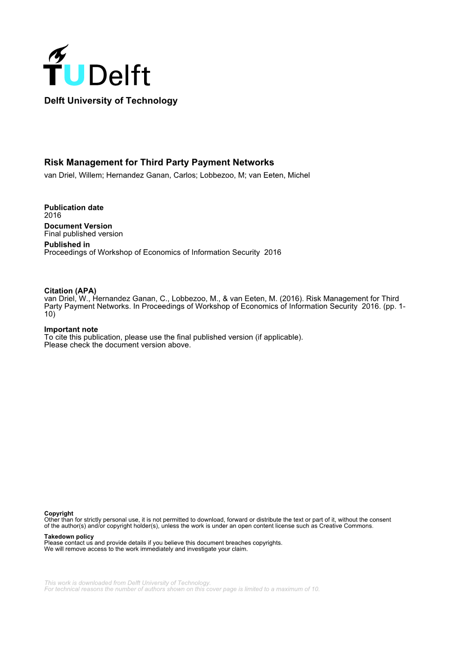 英文题目:Risk Management for Third Party Payment Networks