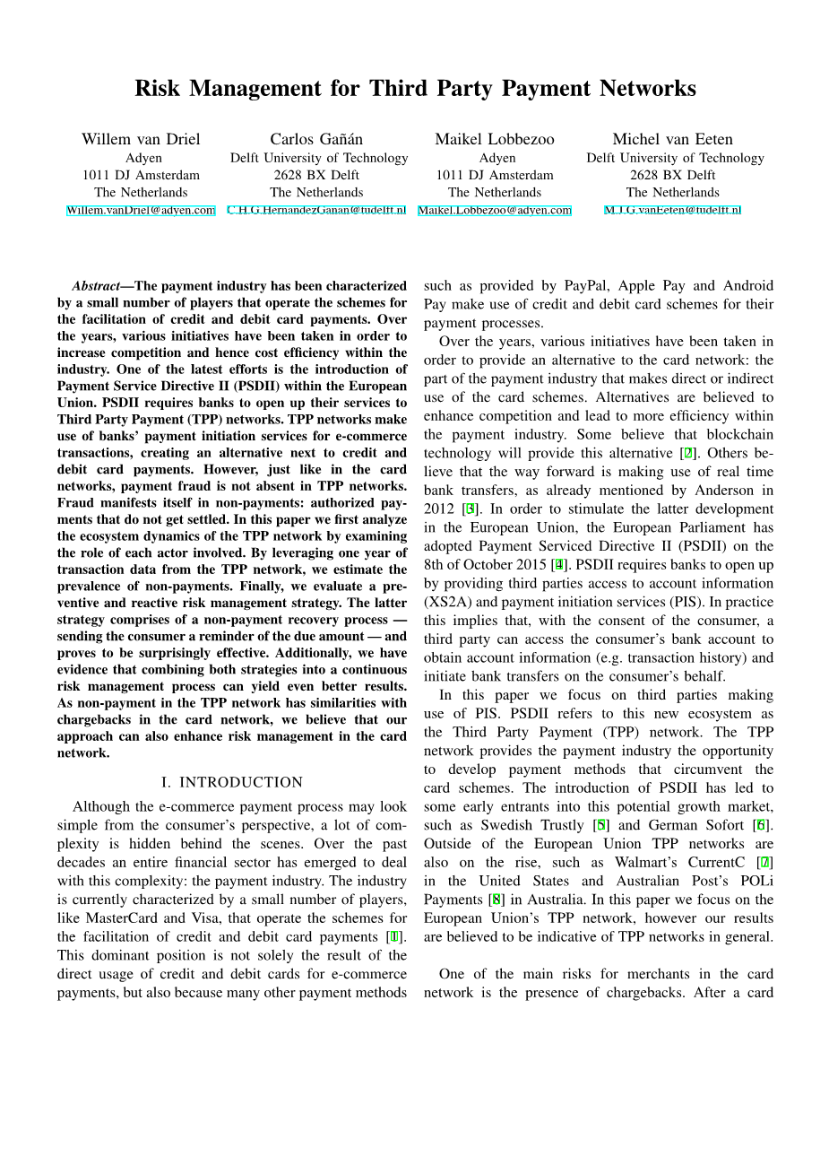 本文的贡献有三个(1)首先,我们分析TPP网络的功能。这使我们能够区分未付款和退款。(2)其次,我们用来自TPP网络的一年交易数据详细分析了不支付特征。结果表明,不付款往往集中在周末,夜间,在特定类型的商人和特定类型的发行银行。(3)最后,我们设计了管理不付款风险的策略,并通过实证应用和评估其有效性。结果表明,虽然预防性风险管理策略对于卡网络而言具有成本效益,但TPP网络可能会更好地服务于被动式策略-即在一定程度上接受发生不付款并减轻其影响。我们看到未来研究的机会,以优化战略,设计新策略并将预防性和反应性策略结合起来,以开发持续风险管理流程。