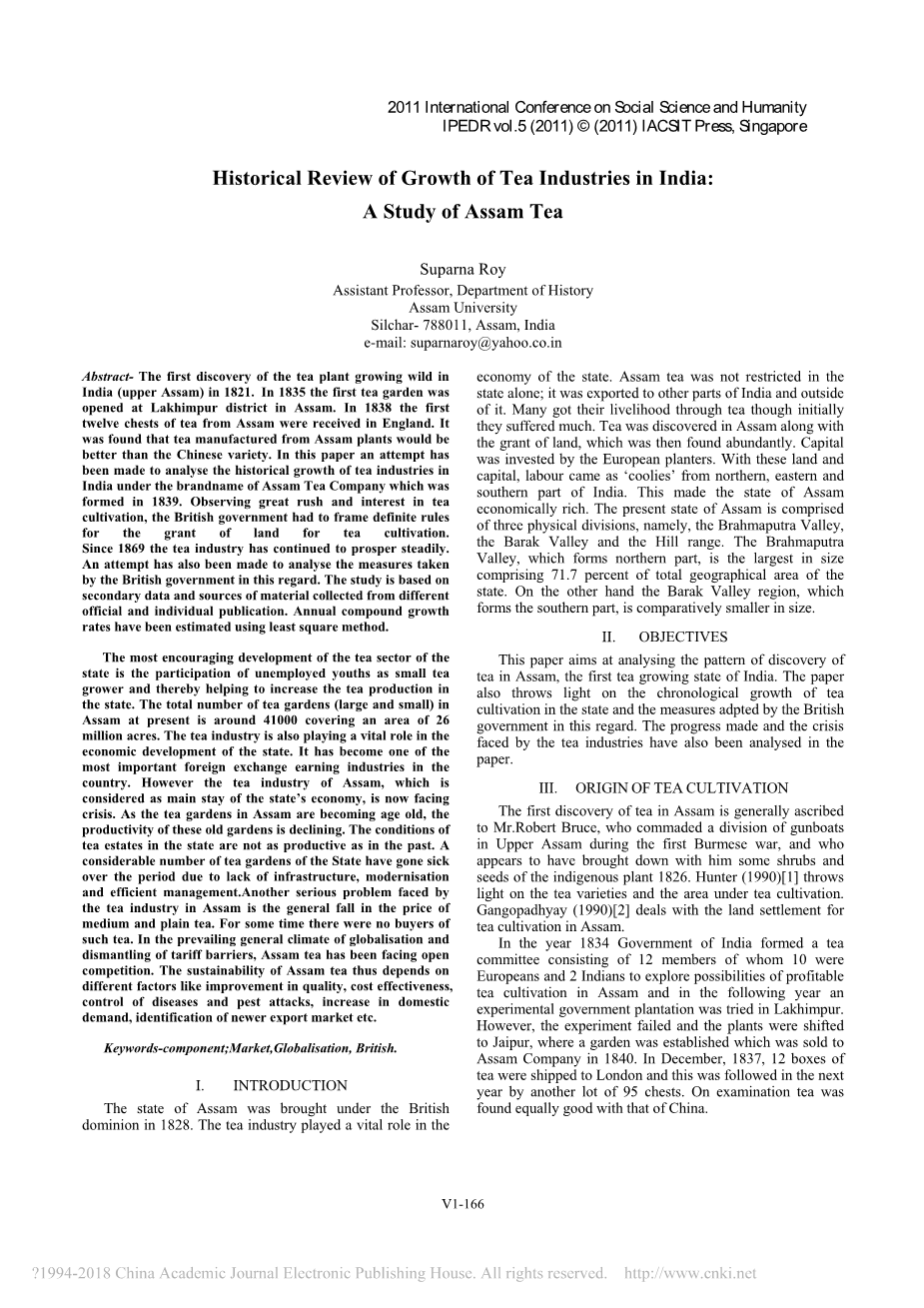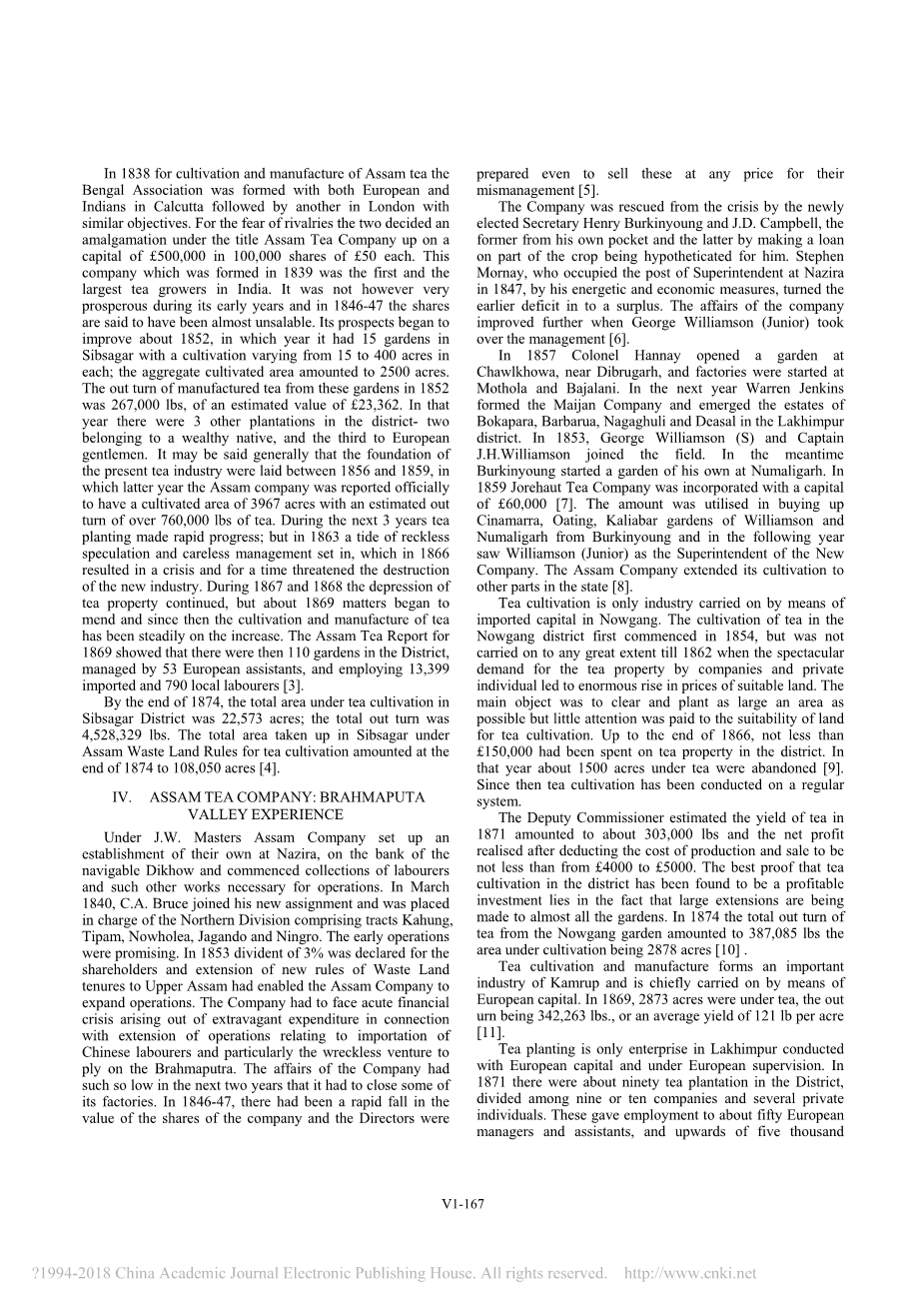摘要 - 于1821年在印度(阿萨姆山上部)野生生长的第一个茶树。1835年,第一座茶园在阿萨姆邦拉金普尔区开张。 1838年,来自阿萨姆邦的前十二箱茶在英格兰收到。 发现从阿萨姆邦工厂生产的茶比中国品种要好。 本文试图分析以1839年成立的阿萨姆茶业公司品牌为基础的印度茶业历史增长情况。英国政府对茶叶种植形成了巨大的冲击和兴趣,因此必须制定明确的授予茶叶种植的土地。 自1869年以来,茶业继续稳步发展。 还试图分析英国政府在这方面采取的措施。 该研究基于二手数据和从不同官方和个人出版物收集的资料来源。 使用最小二乘法估计年复合增长率。