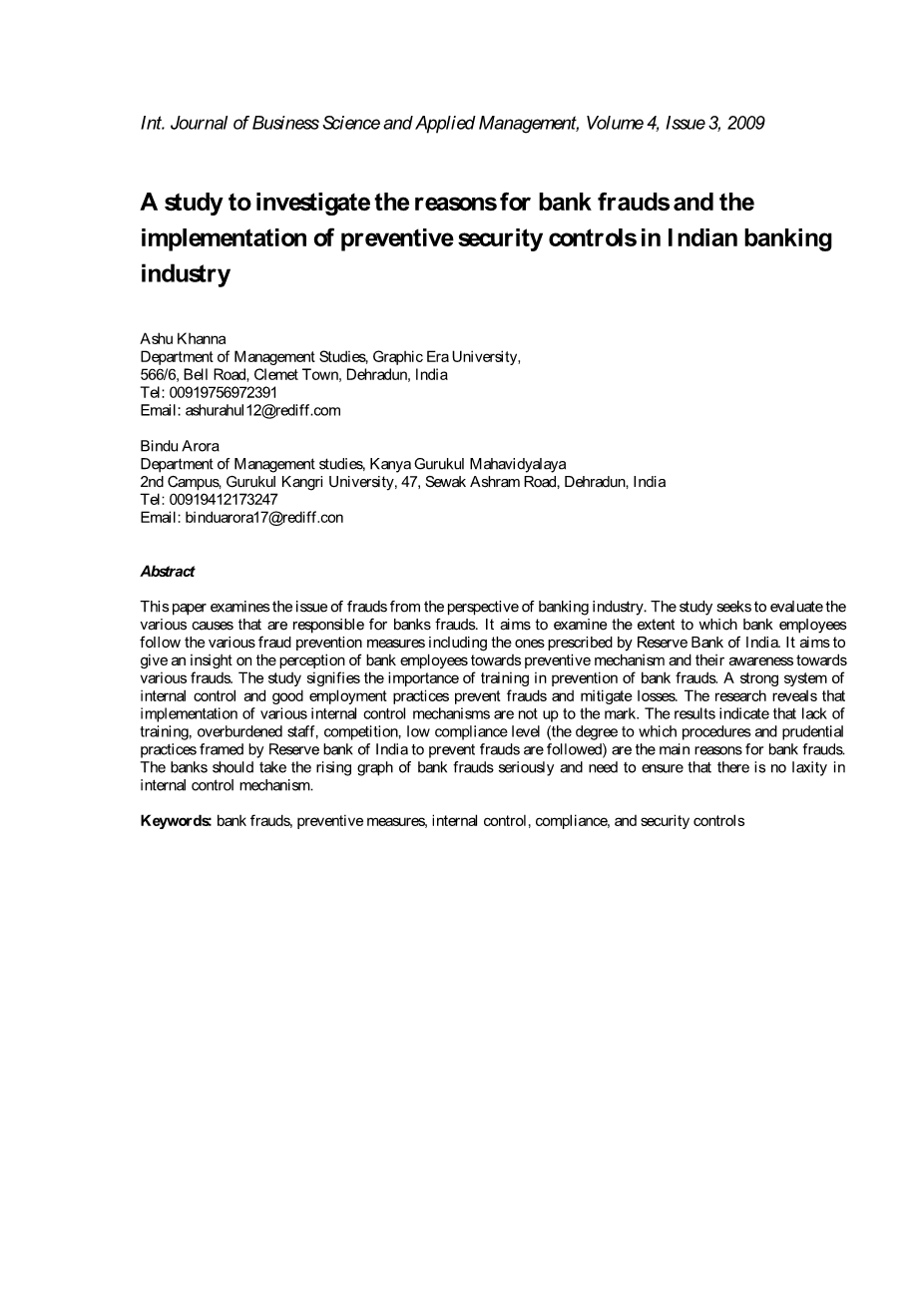 摘要:本文从银行业角度探讨了欺诈问题。该研究旨在评估银行欺诈的各种原因。其目的是检查银行员工遵循各种防欺诈措施的程度,包括印度储备银行规定的措施。它旨在洞察银行员工对预防机制的看法和对各种欺诈行为的认识。这项研究意味着培训在预防银行欺诈方面的重要性。强有力的内部控制制度和良好的就业做法可以防止欺诈和减轻损失。研究表明,各种内部控制机制的实施不符合标准。结果表明,缺乏培训,工作负担过重,竞争不足,遵守程度低(印度储备银行制定的程序和审慎做法,以防止欺诈)是造成银行欺诈的主要原因。银行欺诈行为上升图表严重,需要确保内部控制机制的严格把控。