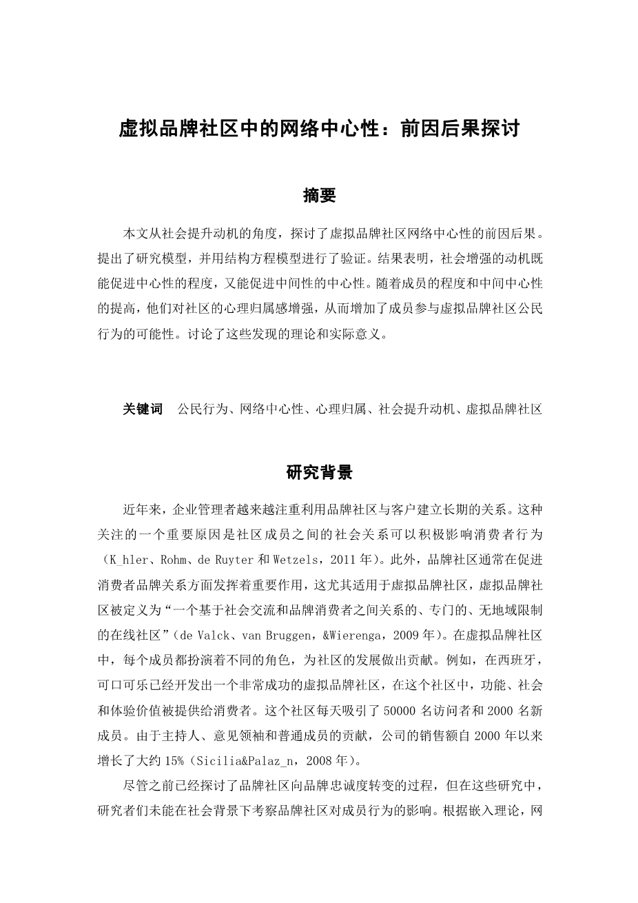 虚拟品牌社区中的网络中心性:前因后果探讨外文翻译资料 2023-02-05 21:38:17 英语原文共 12 页,剩余内容已隐藏,支付完成后下载完整资料 英语译文共 10 页,剩余内容已隐藏,支付完成后下载完整资料 资料编号:[449666],资料为PDF文档或Word文档,PDF文档可免费转换为Word 您需要先支付 30元 才能查看全部内容!立即支付 发小红书推广免费获取该资料资格。点击链接进入获取推广文案即可: Ai一键组稿 | 降AI率 | 降重复率 | 论文一键排版 PREVIOUS NEXT 您可能感兴趣的文章 我国网络游戏消费行为影响因素研究开题报告 我国智能可穿戴设备市场现状及需求预测——以小米手环为例文献综述 绿色家居产品的消费者购买意愿影响因素研究文献综述 大学生绿色食品消费行为与消费理念的研究开题报告 自媒体受众信任度对消费者购买意愿影响的研究——以bilibili为例开题报告 苏省产业结构变动对能源消费影响的实证研究:基于灰色关联法的分析开题报告 新零售模式对企业绩效的影响研究开题报告 数字时代下00后、90后和80后消费者画像比较研究文献综述 经济型酒店营销策略研究-以武汉如家快捷酒店为例文献综述 经济型酒店营销策略研究-以武汉如家快捷酒店为例开题报告