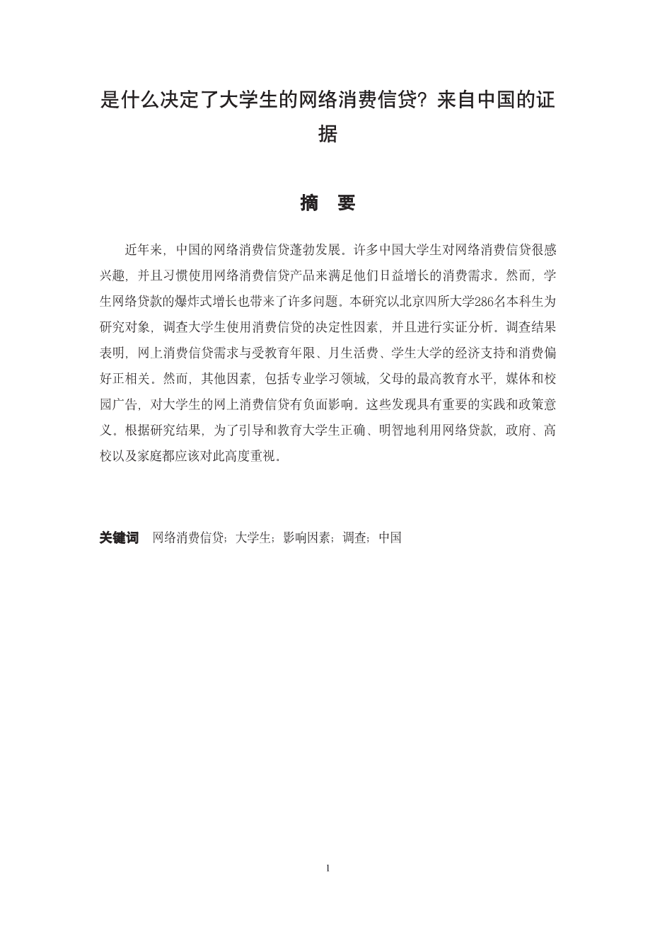 是什么决定了大学生的网络消费信贷?来自中国的证据外文翻译资料 2023-04-14 17:18:11 英语原文共 15 页,剩余内容已隐藏,支付完成后下载完整资料 英语译文共 28 页,剩余内容已隐藏,支付完成后下载完整资料 资料编号:[589439],资料为PDF文档或Word文档,PDF文档可免费转换为Word 您需要先支付 30元 才能查看全部内容!立即支付 发小红书推广免费获取该资料资格。点击链接进入获取推广文案即可: Ai一键组稿 | 降AI率 | 降重复率 | 论文一键排版 PREVIOUS NEXT 您可能感兴趣的文章 我国网络游戏消费行为影响因素研究开题报告 我国智能可穿戴设备市场现状及需求预测——以小米手环为例文献综述 绿色家居产品的消费者购买意愿影响因素研究文献综述 大学生绿色食品消费行为与消费理念的研究开题报告 自媒体受众信任度对消费者购买意愿影响的研究——以bilibili为例开题报告 苏省产业结构变动对能源消费影响的实证研究:基于灰色关联法的分析开题报告 新零售模式对企业绩效的影响研究开题报告 数字时代下00后、90后和80后消费者画像比较研究文献综述 经济型酒店营销策略研究-以武汉如家快捷酒店为例文献综述 经济型酒店营销策略研究-以武汉如家快捷酒店为例开题报告