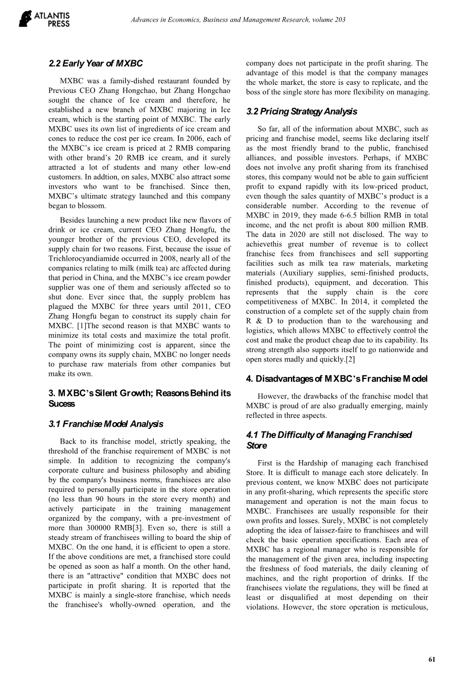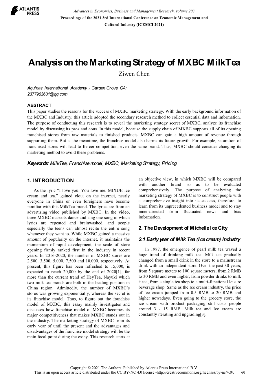 本文研究了蜜雪冰城营销策略成功的原因。本文结合蜜雪冰城和行业的早期背景信息,本文采用二种研究的方法来收集必要的数据和信息。进行本研究的目的是分析蜜雪冰城的营销策略,分析其特许经营模式,讨论其优点和缺点。因为蜜雪冰城在供应链上从原材料到成品支持所有的门店,蜜雪冰城因此可以获得稳定的收入。但同时,特许经营模式也损害其未来的增长。例如,特许经营商店的饱和将会导致更激烈的竞争,即使是同样的品牌。因此,蜜雪冰城应该考虑改变其营销方法来避免这些问题。