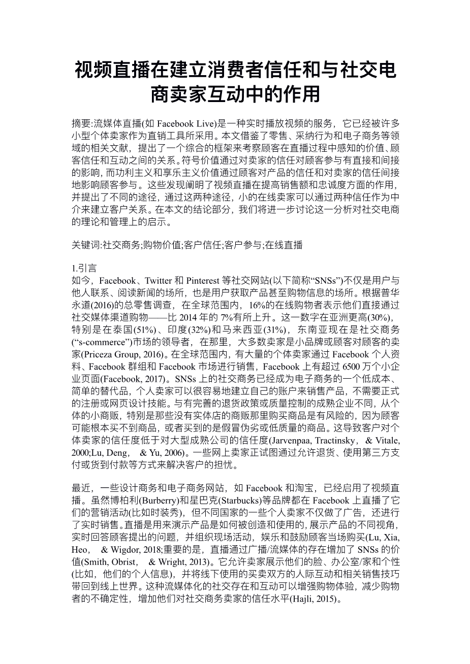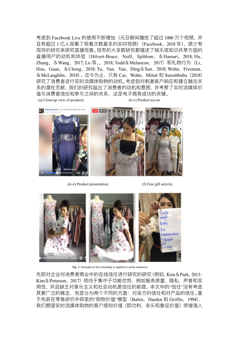 Recently, some s-commerce and e-commerce sites such as Facebook and Taobao have enabled live video streaming. While brands such as Burberry and Starbucks have used Facebook Live to broadcast their marketing activities (e.g., fashion shows), several individual sellers in various countries go beyond advertising to real time to sell their pro- ducts. Live streaming is used to demonstrate how products are created and used, to show different perspectives of products, to answer cus- tomer questions in real time, and to organize live activities that entertain and encourage customers to buy on the spot (Lu, Xia, Heo, amp; Wigdor, 2018; an example is illustrated in Fig. 1). Importantly, live streaming adds value to the SNSs through the existence of broadcasters/ streamers (Smith, Obrist, amp; Wright, 2013). It allows sellers to reveal their faces, offices/homes, and personalities (i.e., social presence), and brings the buyer–seller interpersonal interaction and related selling techniques used offline back to the online world. Such livestreaming- enabled social presence and interaction can enhance the shopping experience, reduce shoppers uncertainty, and increase the level of trust they have toward the s-commerce seller (Hajli, 2015).