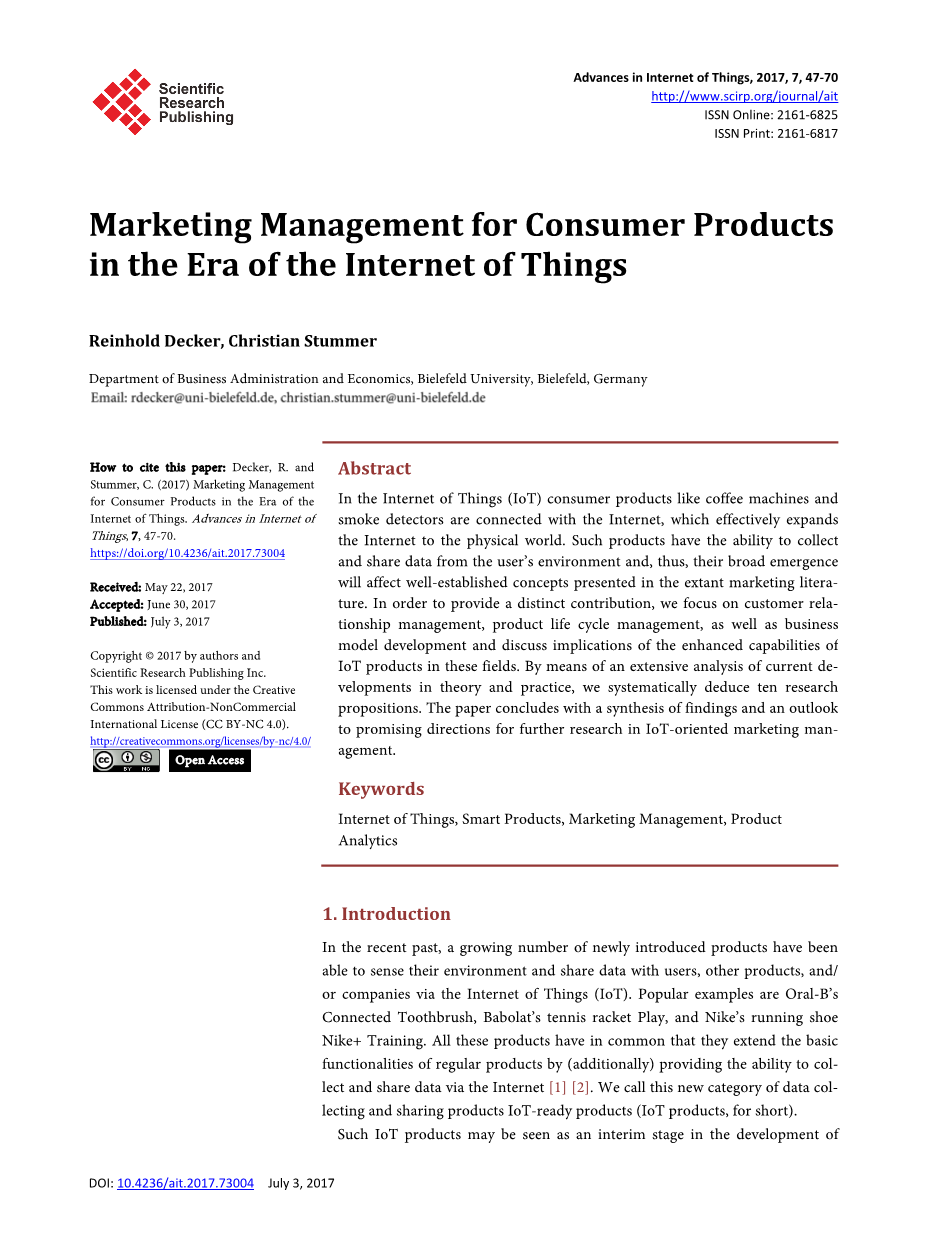在物联网(IoT)中,咖啡机和烟雾探测器等消费品与互联网相连,有效地将互联网扩展到了物理世界。这些产品能够从用户环境中收集和共享数据,因此,它们的广泛出现将影响现有营销文献中提出的成熟概念。为了提供独特的贡献,我们将重点放在客户关系管理、产品生命周期管理以及业务模型开发上,并讨论物联网产品在这些领域增强能力的意义。通过对当前理论和实践发展的广泛分析,系统地推导出十个研究命题。本文最后对研究结果进行了总结,并对物联网营销管理的进一步研究提出了展望。
