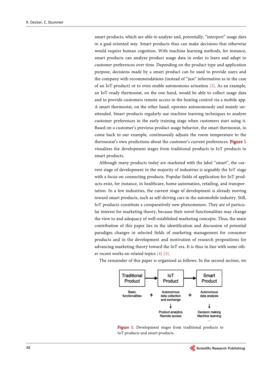 在最近的过去,越来越多的新推出的产品能够感知其环境,并通过物联网(IoT)与用户、其他产品和/或公司共享数据。最受欢迎的例子是欧乐B的连接牙刷、巴博拉的网球拍和耐克的跑步鞋耐克 训练。所有这些产品都有一个共同点,即它们通过(另外)提供通过互联网收集和共享数据的能力来扩展常规产品的基本功能。我们称这类新的数据收集和共享产品为物联网产品(简称物联网产品)。此类物联网产品可能被视为智能产品开发的过渡阶段,智能产品能够以面向目标的方式分析和潜在地“解释”使用数据。因此,智能产品可以做出需要人类认知的决策。例如,通过机器学习方法,智能产品可以分析产品使用数据,以便随着时间的推移学习和适应客户的偏好。根据产品类型和应用目的,智能产品做出的决策可用于向用户和公司提供建议(而不是像物联网产品那样“仅仅”提供信息),甚至可实现自主驱动。例如,一方面,物联网恒温器能够收集使用数据,并通过移动应用程序为客户提供对加热控制的远程访问。另一方面,智能恒温器可以自动工作,而且主要是无人值守。智能产品在客户开始使用机器学习技术的早期培训阶段定期使用机器学习技术来分析客户的偏好。回到我们的例子,基于客户以前的产品使用行为,智能恒温器不断地根据恒温器自己对客户当前偏好的预测来调整室温。图1展示了从传统产品到物联网产品再到智能产品的发展阶段。尽管如今许多产品都贴上了“智能”的标签,但大多数行业目前的发展阶段可以说是物联网阶段,其重点是连接产品。物联网产品的流行应用领域存在,例如,在医疗保健、家庭自动化、零售和运输领域。在一些行业,目前的发展阶段已经向智能产品发展,比如汽车行业的自动驾驶汽车。尽管如此,物联网产品还是一个比较新的现象。它们对营销理论特别感兴趣,因为它们新颖的功能可能会改变对成熟营销概念的看法和充分性。因此,本文的主要贡献在于识别和讨论消费品营销管理某些领域的潜在范式变化,以及为推动营销理论走向物联网时代而提出的研究命题的发展和动机。因此,它与最近有关主题的一些其他著作是一致的。