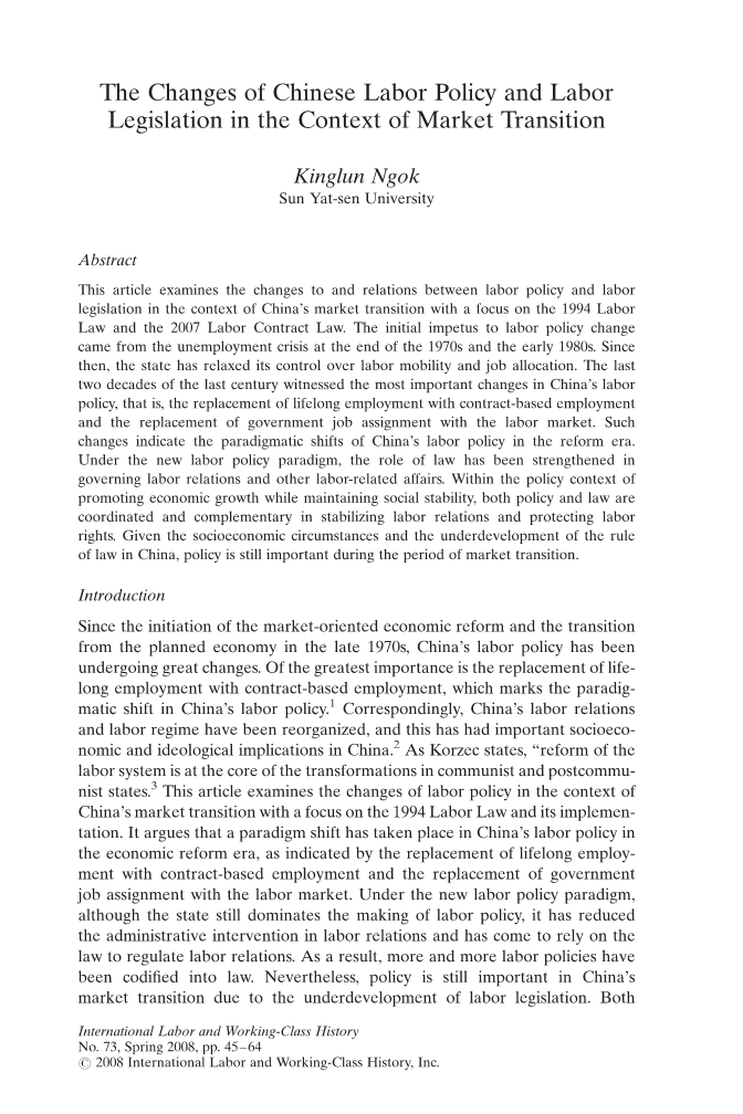 自从20世纪70年代后期开始面向市场的经济改革和计划经济的转型以来,中国的劳动政策一直在发生着巨大的变化。最重要的是用合同制就业取代终身就业,这标志着中国劳动政策的范式转变[1]。相应地,中国的劳动关系和劳动制度已经重组,这在中国已经产生了重要的社会经济和意识形态影响[2]。正如Korzec所说,“劳动制度改革是共产主义和后共产主义国家转型的核心[3]。本文考察了1994年劳动法及其实施过程中中国市场转型背景下劳动政策的变化。 它认为,在经济改革时代,中国的劳动政策发生了范式转变,正如以合同为基础的就业取代终身雇用和用劳动力市场取代政府工作任务所表明的那样。在新的劳动政策范式下,虽然国家仍然主导着劳动政策的制定,但减少了对劳动关系的行政干预,并依靠法律来规范劳动关系。 因此,越来越多的劳动政策已经被编入法律。 尽管如此,由于劳动立法不发达,政策对中国市场转型依然重要。政策和法律在贯彻执行党国方针时是相辅相成的。 然而,劳工政策与劳动法之间的不一致并不少见。