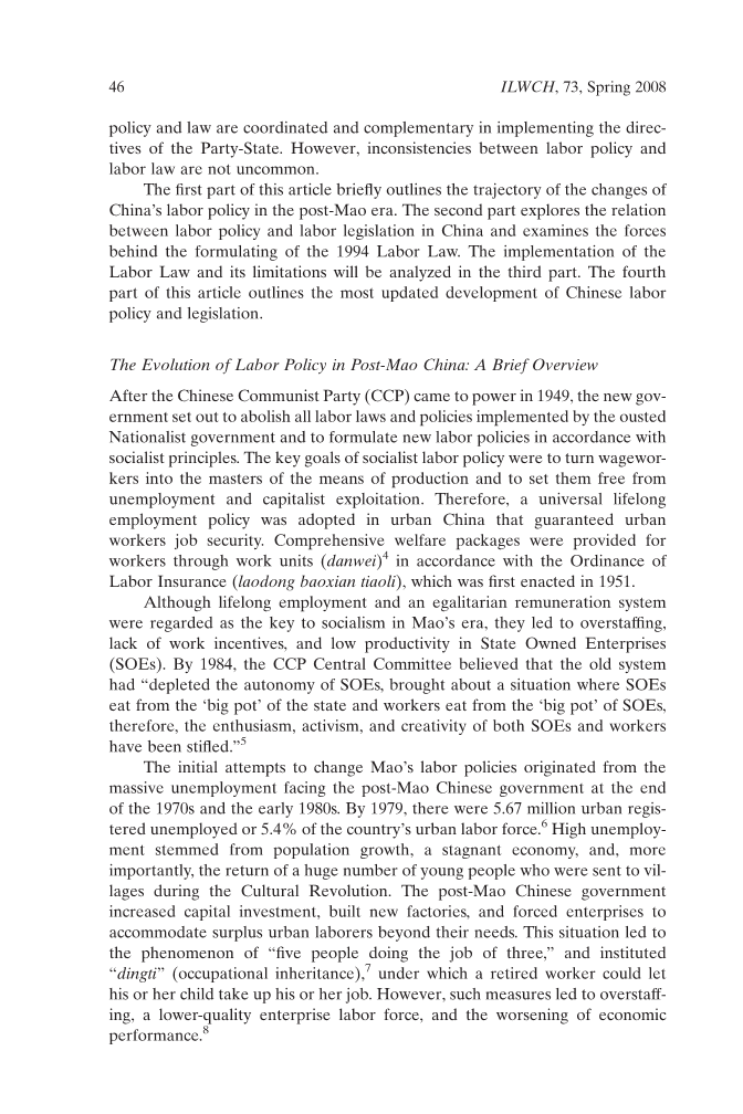 本文第一部分简要概述了后毛泽东时代中国劳动政策变化的轨迹。 第二部分探讨了中国劳动政策与劳动立法之间的关系,并考察了制定1994年劳动法背后的力量。第三部分将分析“劳动法”的实施情况及其局限性。 本文的第四部分概述了中国劳动政策和立法的最新发展。