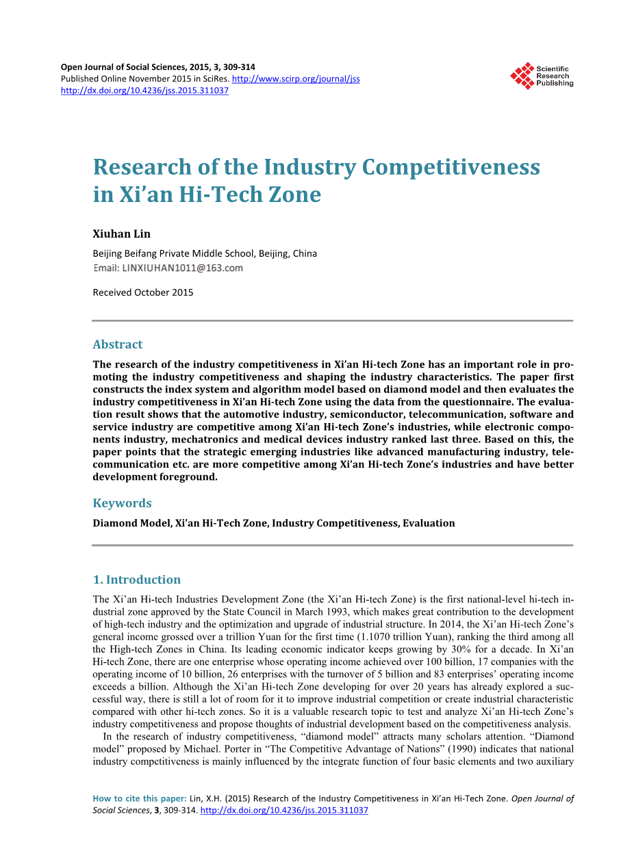 关键词:钻石模型,西安高新区,行业竞争力,评估