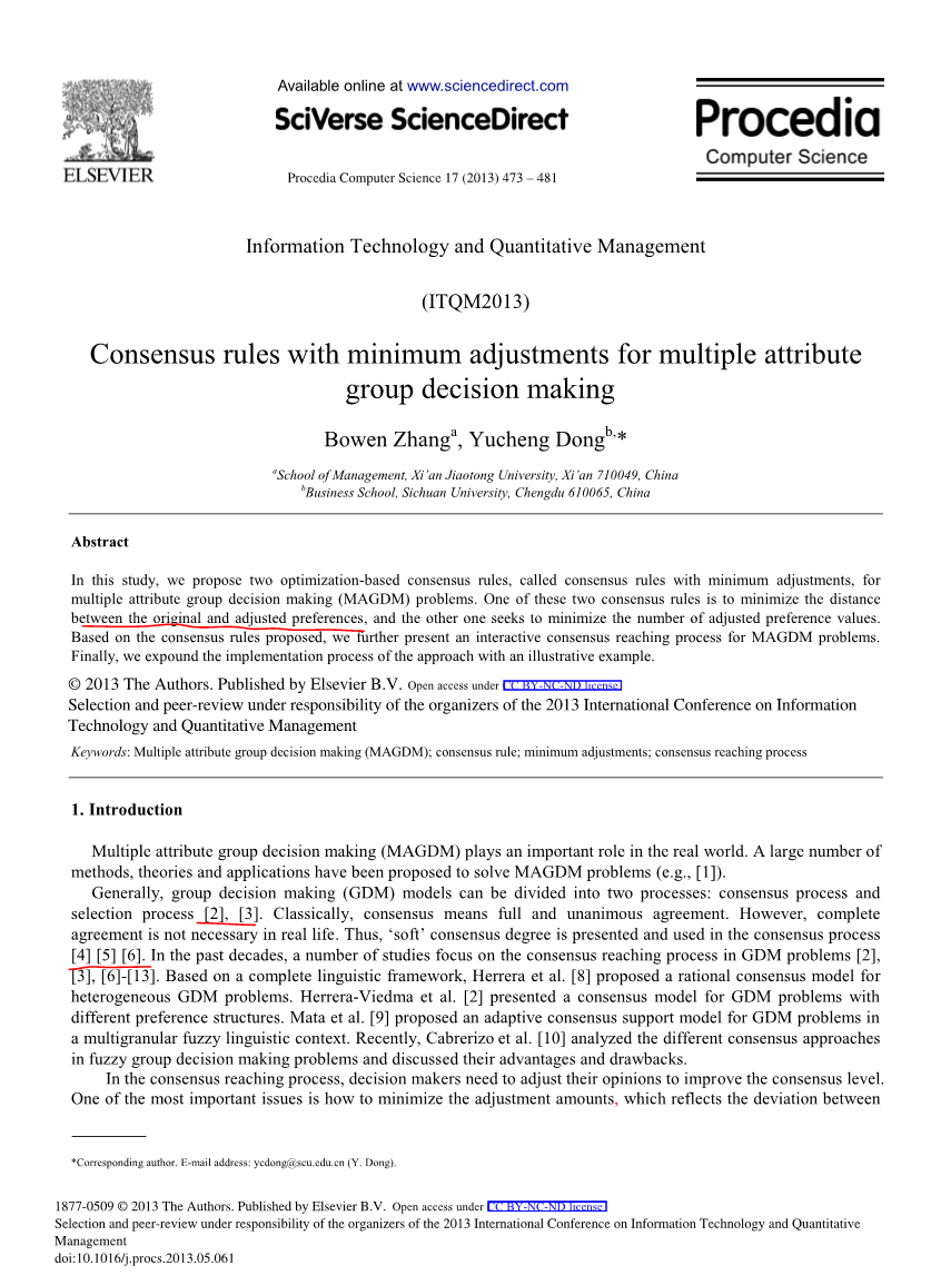 多属性群决策(MAGDM)在现实世界中起着重要的作用。 已经提出了大量的方法,理论和应用来解决MAGDM问题。一般来说,群体决策(GDM)模型可以分为两个步骤:共识过程和选择过程[2],[3]。通常,共识意味着全面一致的协议。 但是,完全的同意在现实生活中是不必要的。 因此,提出了软共识度并将其应用在共识过程中[4] [5] [6]。在过去几十年中,很多研究侧重于群决策问题达成共识[2][3],[6] - [13]。基于完整的语言框架,Herrera等 [8]提出了异构GDM问题的理性共识模型。 Herrera-Viedma等 [2]提出了具有不同偏好结构的GDM问题的共识模型。 Mata等 [9]提出了多粒度模糊语言环境下的GDM问题的适应性共识支持模型。 最近,Cabrerizo等人 [10]分析了模糊群决策问题中的不同共识方法,并讨论了其优缺点。在达成共识的过程中,决策者需要调整意见,提高共识水平。最重要的问题之一是如何尽量减少调整值,调整值反映出每个决策者初始意见与调整意见之间的偏差。 因此,Dong等 [14]提出了一个共识算子这个共识算子为GDM问题提供了一个备选的共识模型,以最大限度地减少初始意见和调整意见之间的偏差。 此外,Ben-Arieh和Easton [15]和Ben-Arieh等人人。 [16]提出了一个共识成本的新概念,改变每个决策者意见1单位距离的单位成本是不同的。他们还提出了几个最小成本共识模型,该模型主要致力于最小化共识成本。 最近,张等人 [17]扩展了最小成本共识模型,并提出了一种新颖的框架,以实现集结算子下的最小成本共识。在本文中,我们提出两个对MAGDM问题进行最小调整的共识规则。 与现有关于最小调整共识模型的研究相比,我们的共识规则主要可以弥补两个不足: