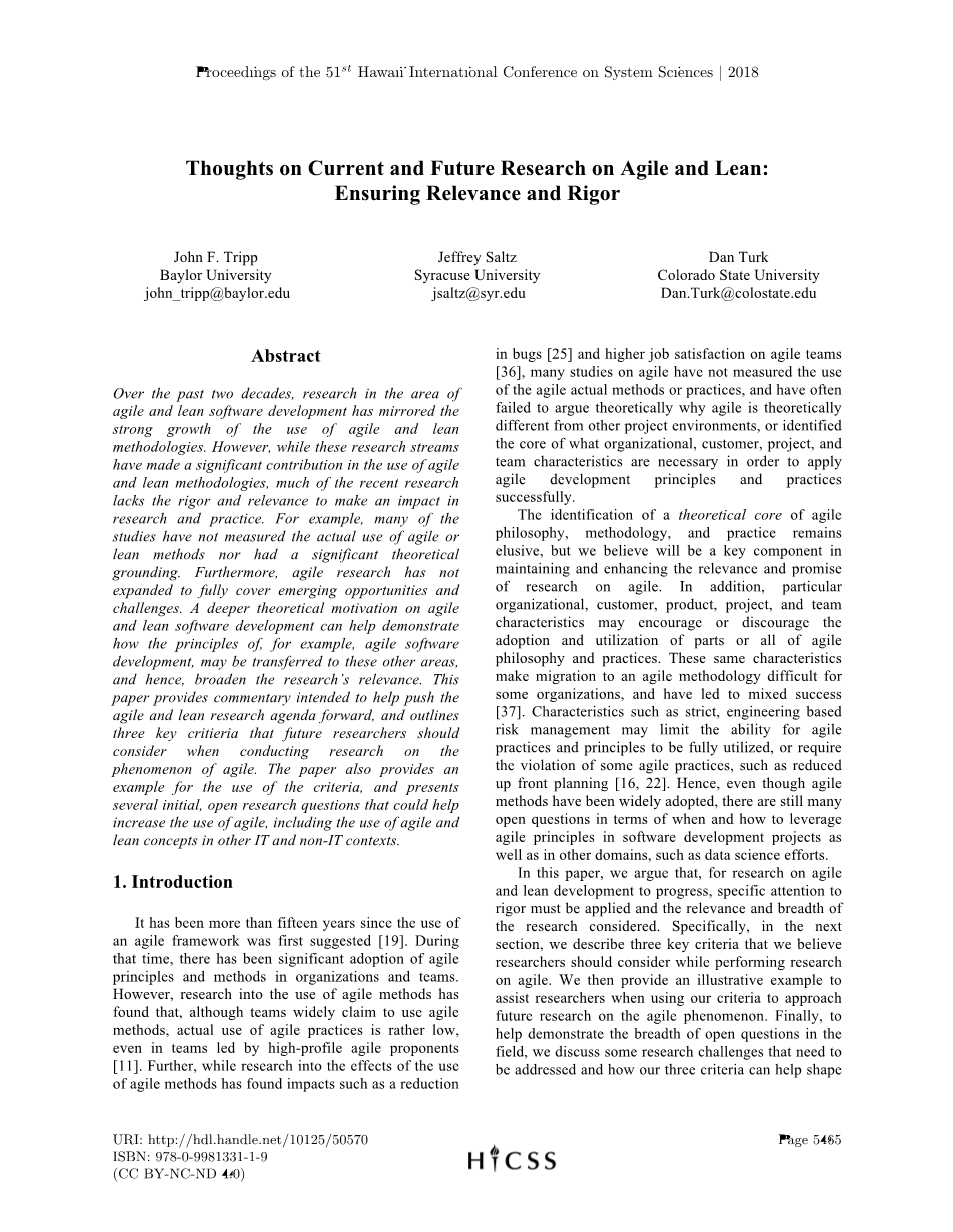 确定敏捷哲学、方法论和实践的理论核心仍然是一个难题,但我们相信这将是维护和增强敏捷研究的相关性和前景的一个关键组成部分。此外,特定的组织、客户、产品、项目和团队特征可能会鼓励或阻碍部分或全部敏捷哲学和实践的采用和利用。这些相同的特性使得向敏捷方法的迁移对于一些组织来说非常困难,并且导致了混合成功的[37]。严格的、基于工程的风险管理等特征可能会限制充分利用敏捷实践和原则的能力,或者需要违反一些敏捷实践,比如减少预先规划[16,22]。因此,尽管敏捷方法已经被广泛采用,但在何时以及如何在软件开发项目以及其他领域(如数据科学领域)中利用敏捷原则方面,仍然存在许多悬而未决的问题。