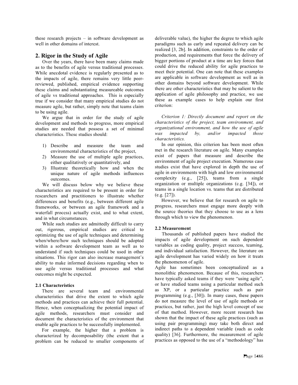 敏捷有时被认为是一个整体现象。因此,研究人员通常会询问团队是否“使用了敏捷”,或者是否使用了特定的方法(如XP)或特定的实践(如结对编程,如[30])来研究团队。在许多情况下,这些论文并没有度量敏捷方法或实践的使用级别,而是只度量方法使用的高级概念。然而,最近的研究表明,这些敏捷实践(如使用结对编程)的影响可能会直接或间接地影响到一个因变量(如代码质量)[36]。此外,与使用“方法论”相对的敏捷实践的度量方法变得更加普遍。(e.g.,25,36)。这种从方法到实践的转变是恰当的;研究表明,很少有团队采用敏捷方法作为一个整体,而是根据他们各自的情况来定制它们。因此,我们主张对敏捷进行严格研究的第二个标准。