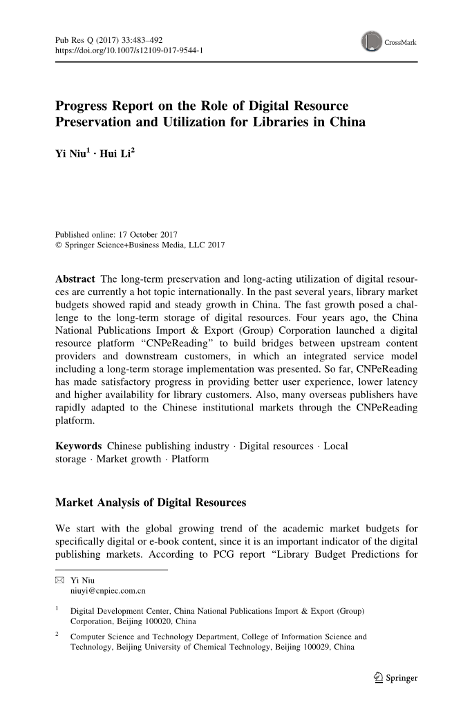 作为最大的出版物进出口企业,中国国家出版物进出口(集团)总公司(CNPIEC)将数字资源的长期保存和服务纳入了名为CNPeReading [ 8 ] 的项目,这是一个数字化的项目。资源业务和服务平台在线运行。在该项目中,CNPIEC通过技术,模型和服务的创新,帮助海外出版商以市场导向的方式顺利进入中国市场。中国图书馆对地方保护和有效利用数字资源的要求也可以实现[ 9]。